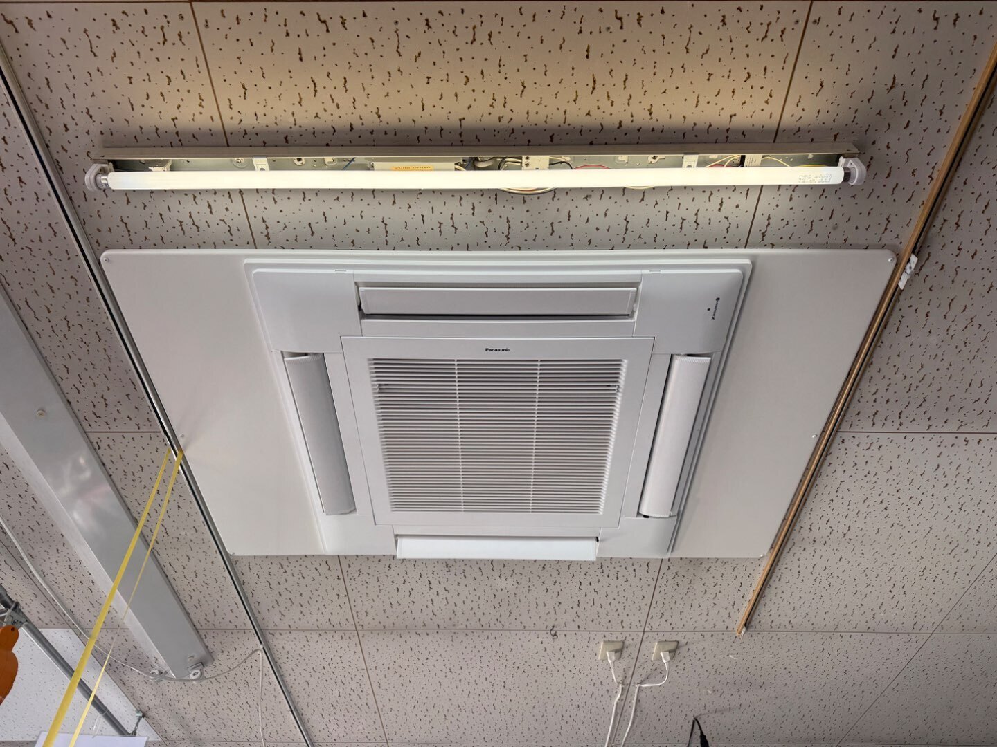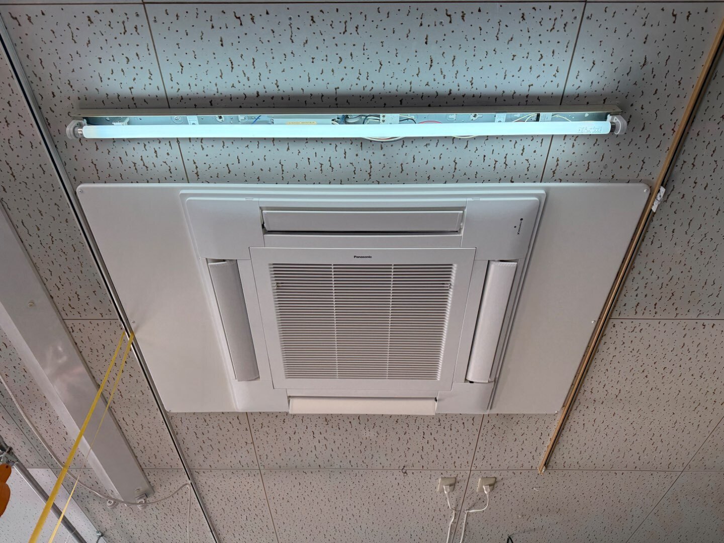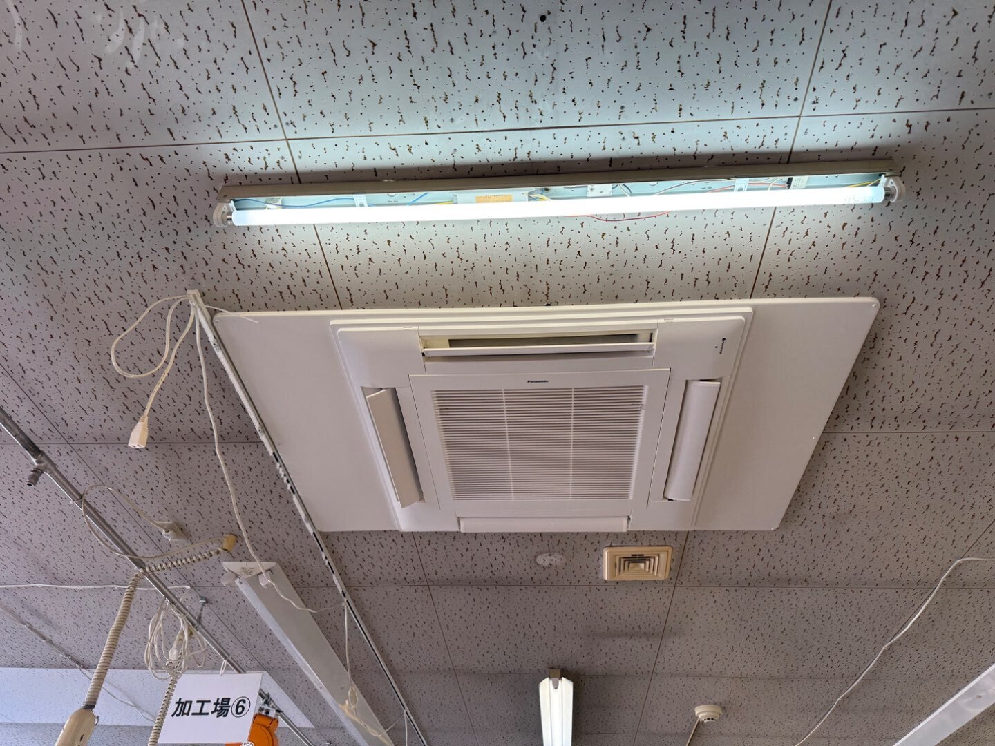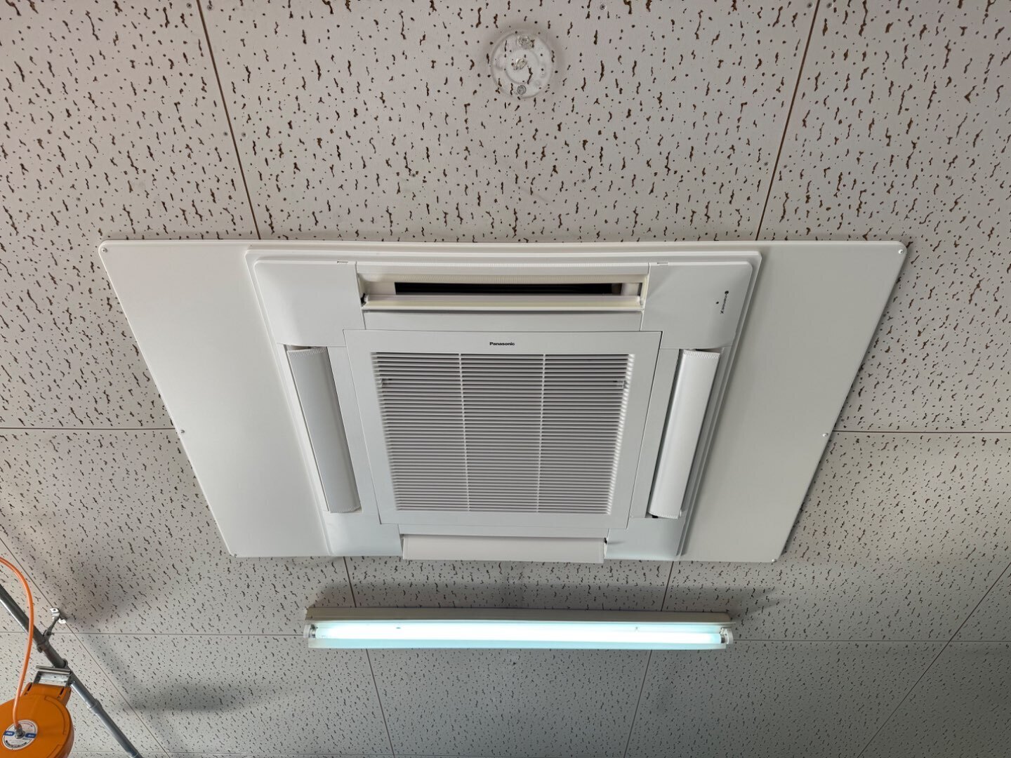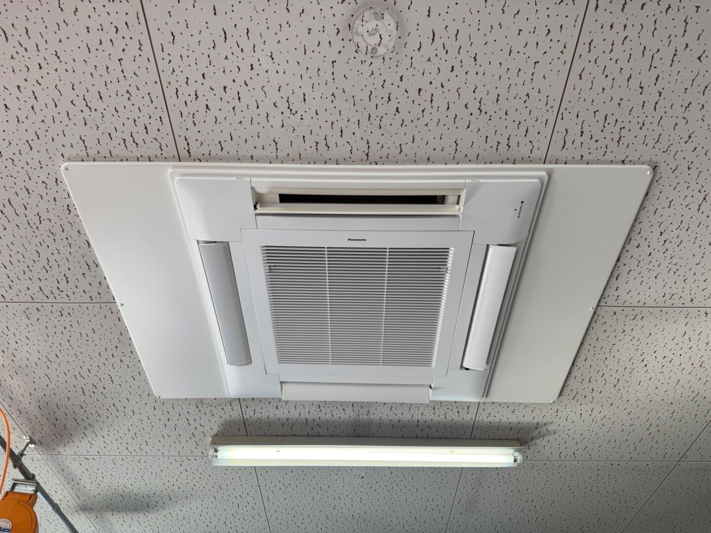 今回の工事では、**天井埋込カセット形業務用エアコン(4方向吹出タイプ)**を採用しています。