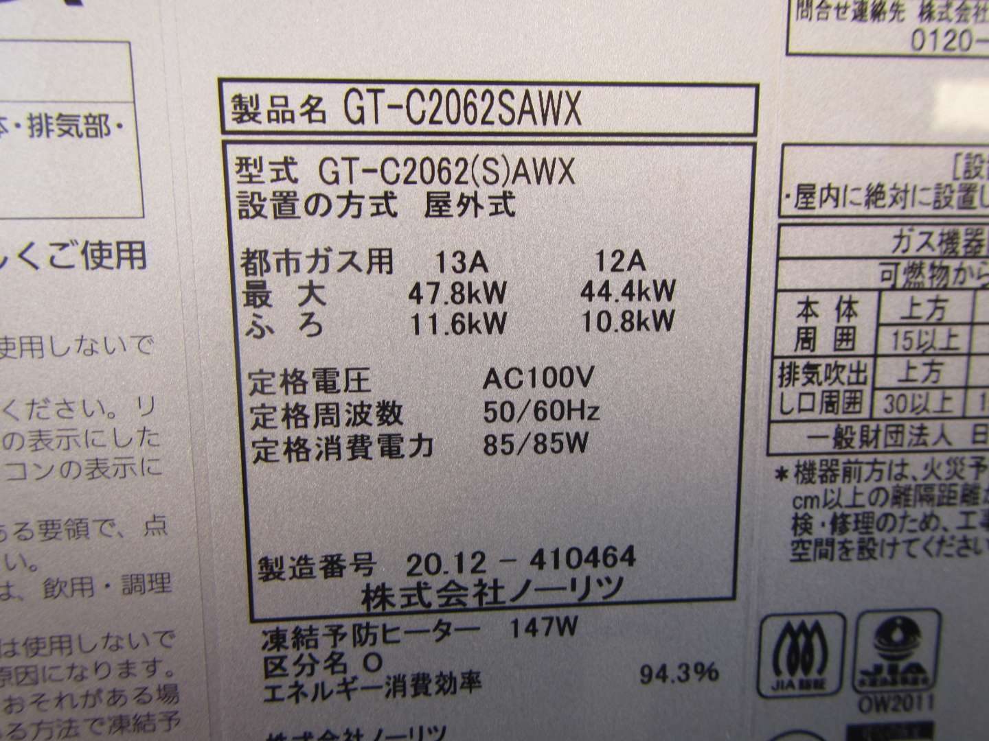 6.新規機器情報 ノーリツ エコジョーズ ガスふろ給湯器 型式 GT-C2062AWX 13A 都市ガス用。