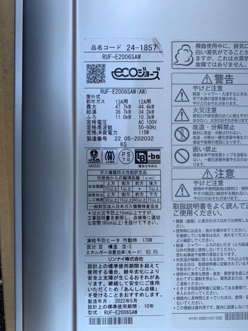 5.新規機器情報 リンナイ製ガスふろ給湯器。型式 RUF-E2406SAW 13A。