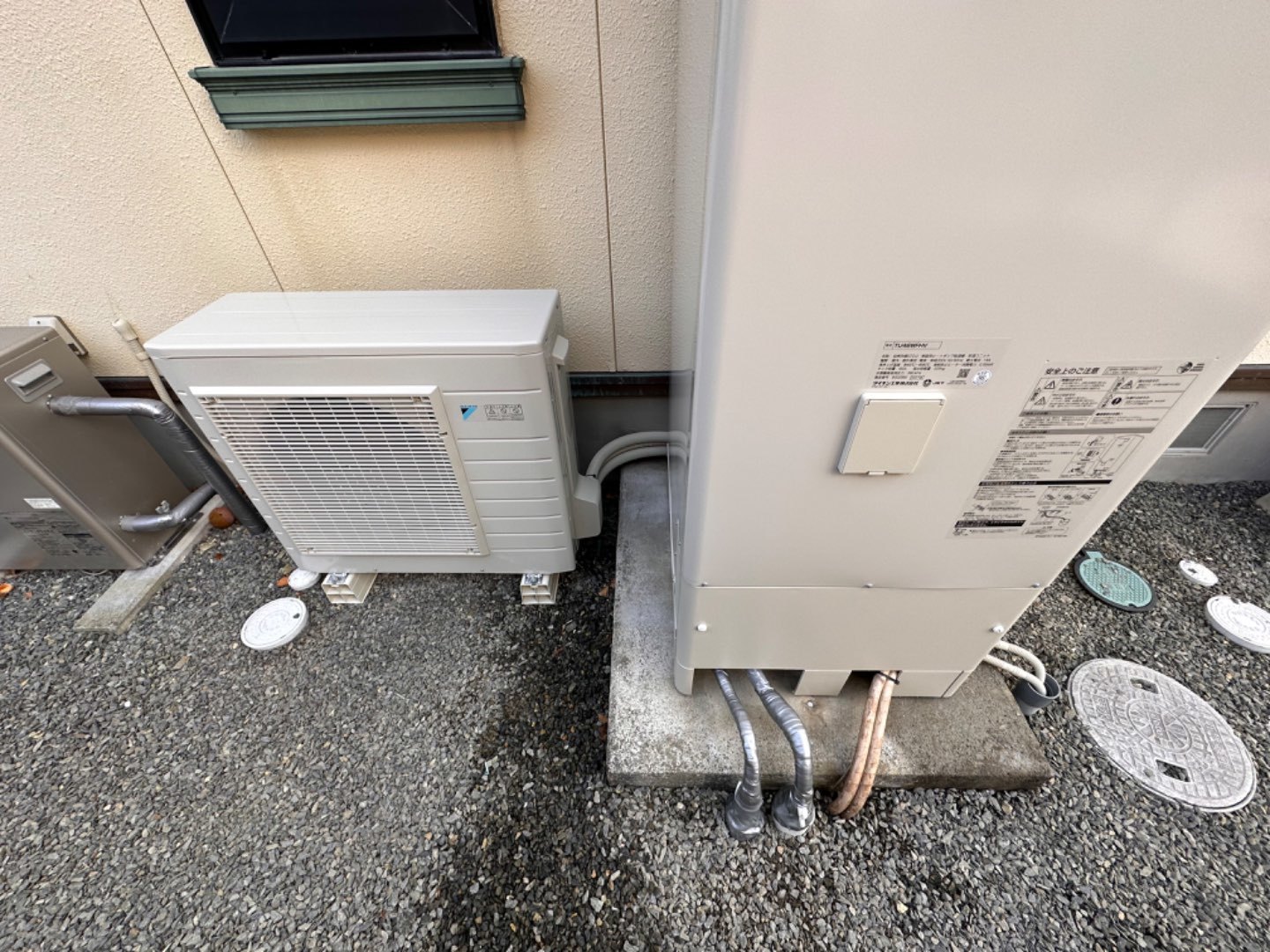 新規エコキュートタンク・ヒートポンプ搬入据付・配管工 事