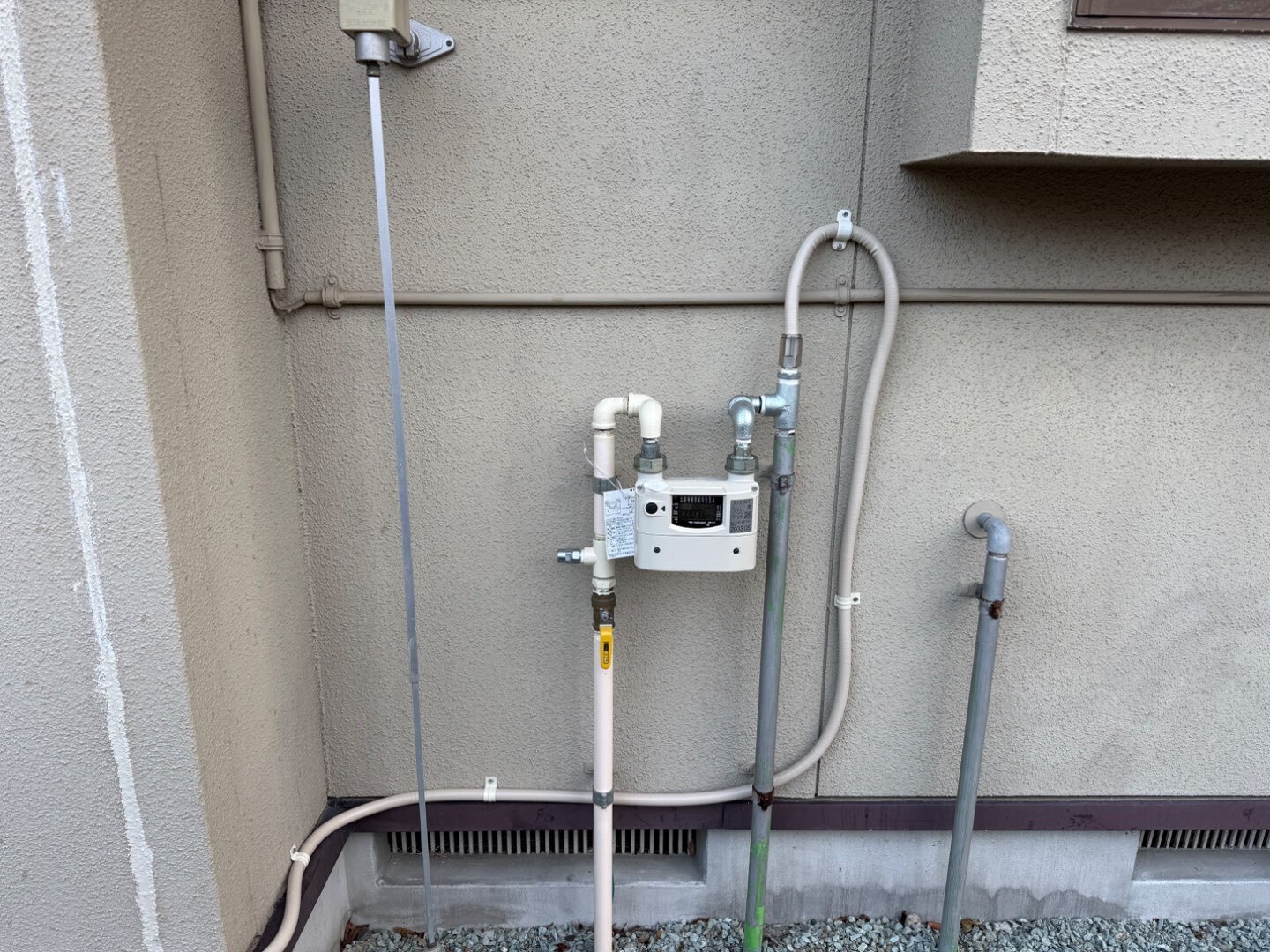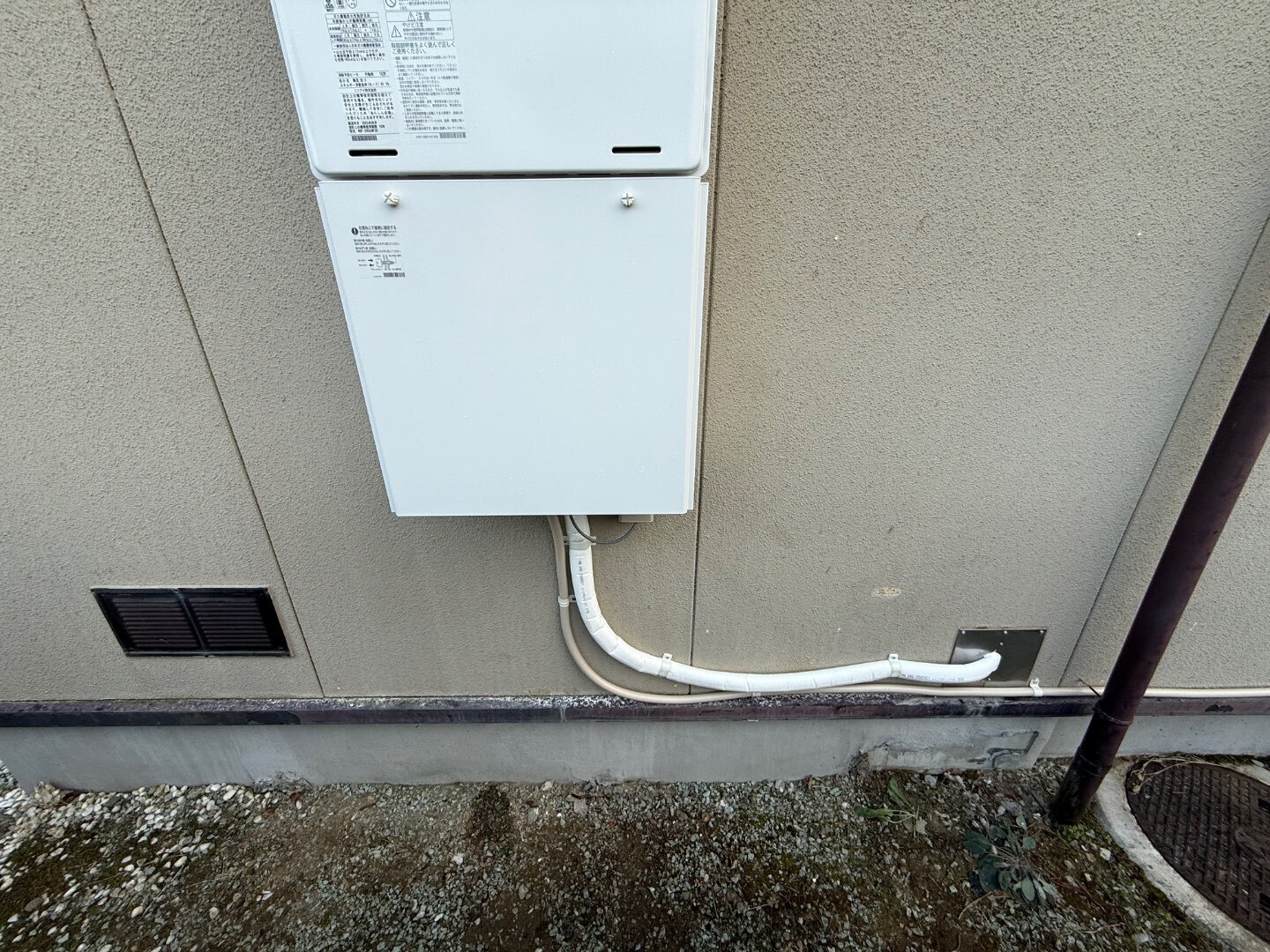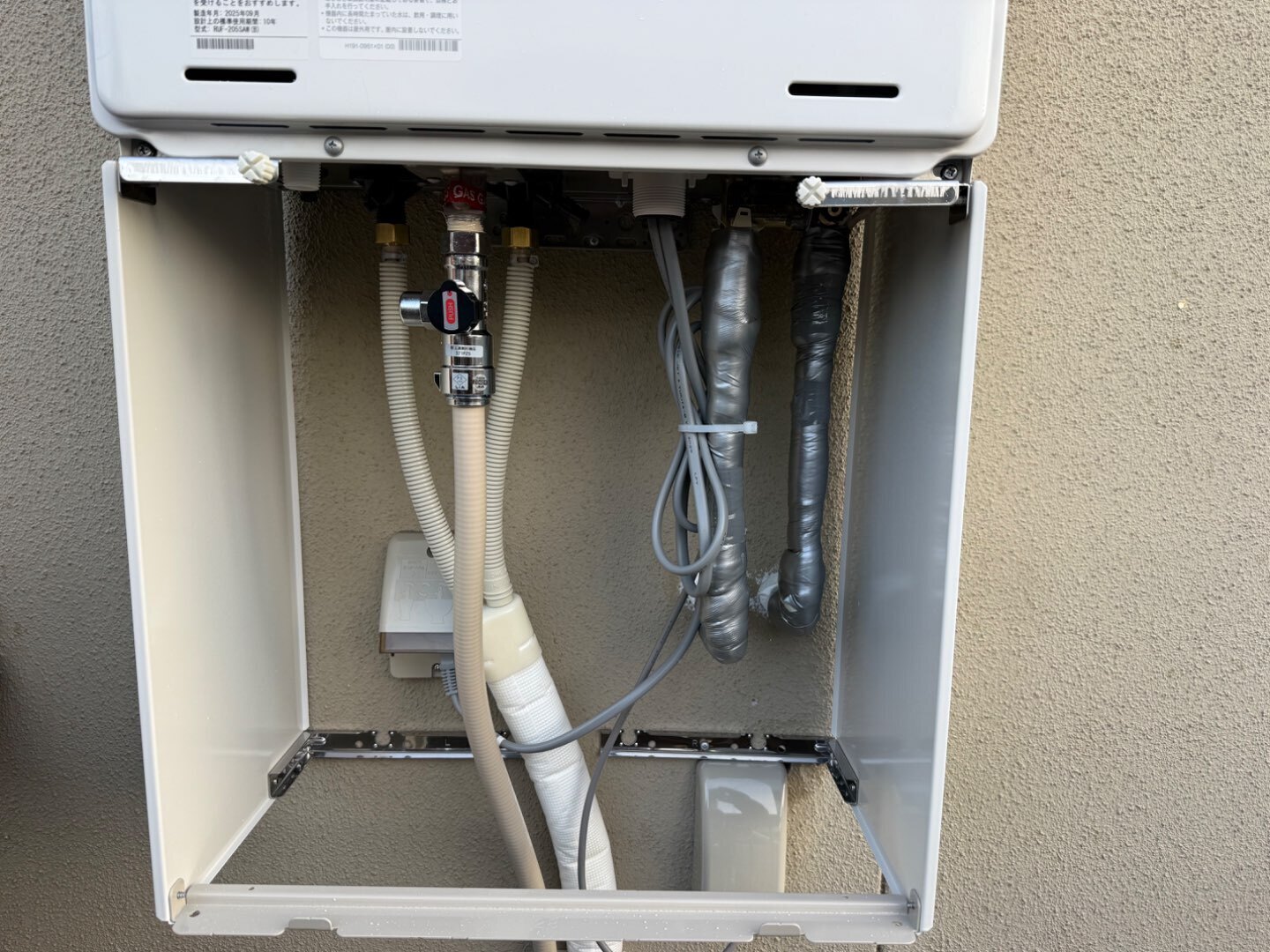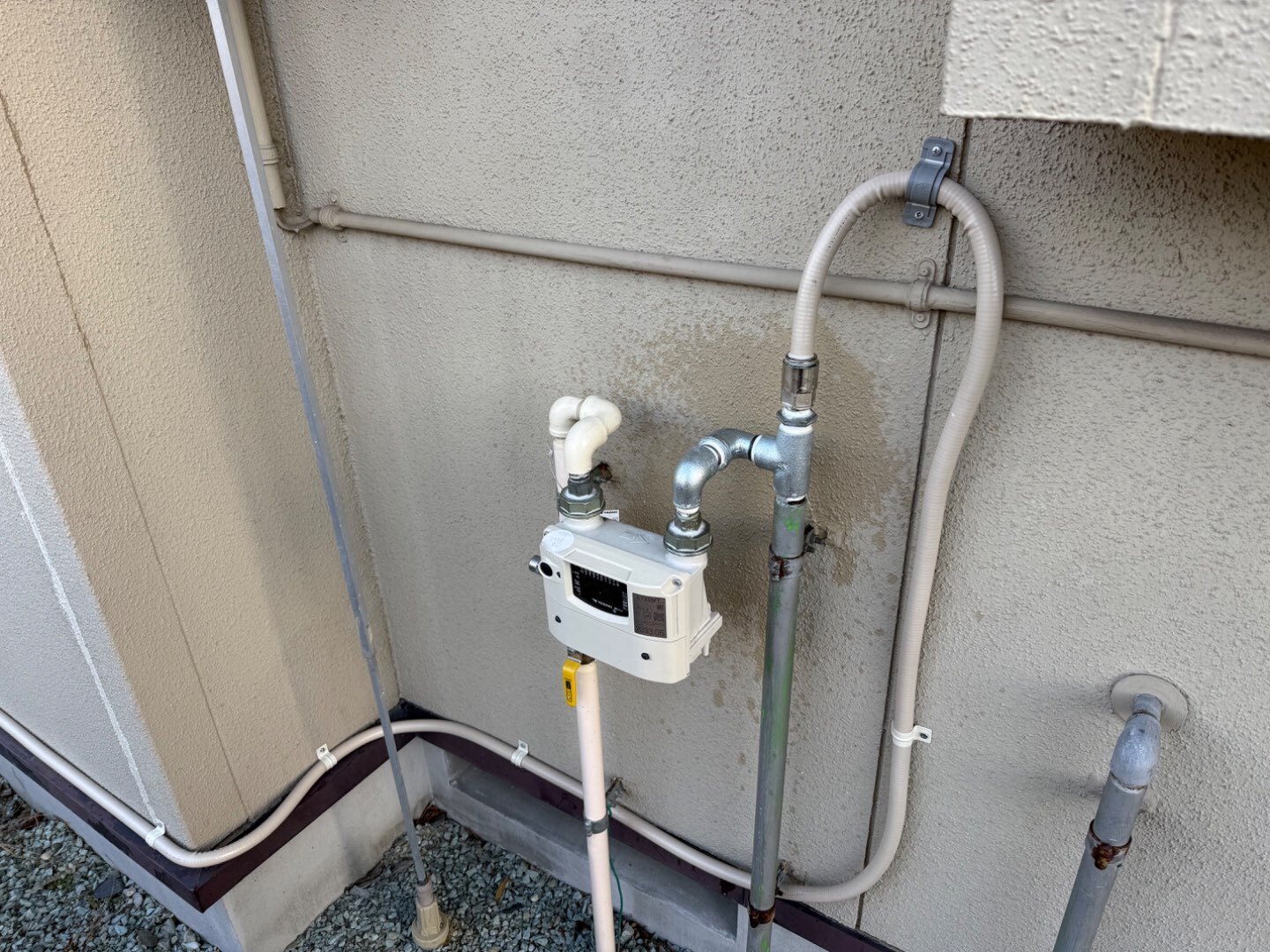 給湯配管・ガス配管ともに新たにルートを整理し、外壁色に合わせた丁寧な仕上げで美観を確保。