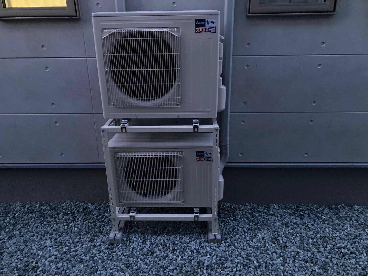 敷地条件を考慮し、室外機は縦置き2段架台にて設置しました。