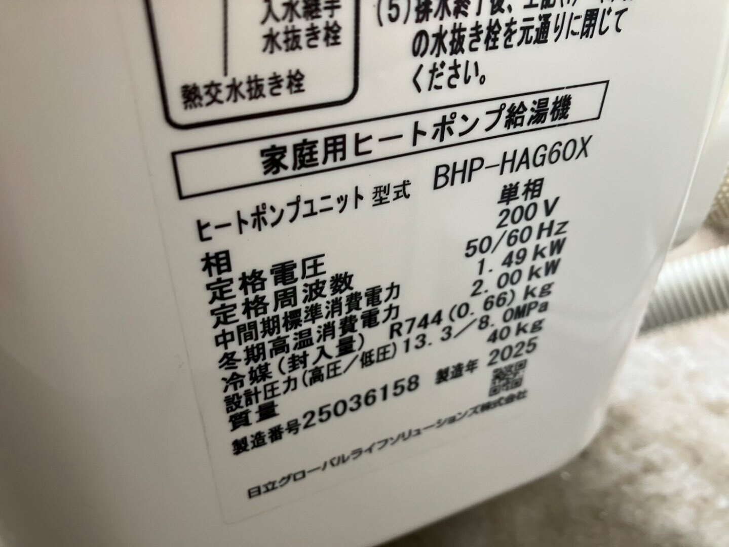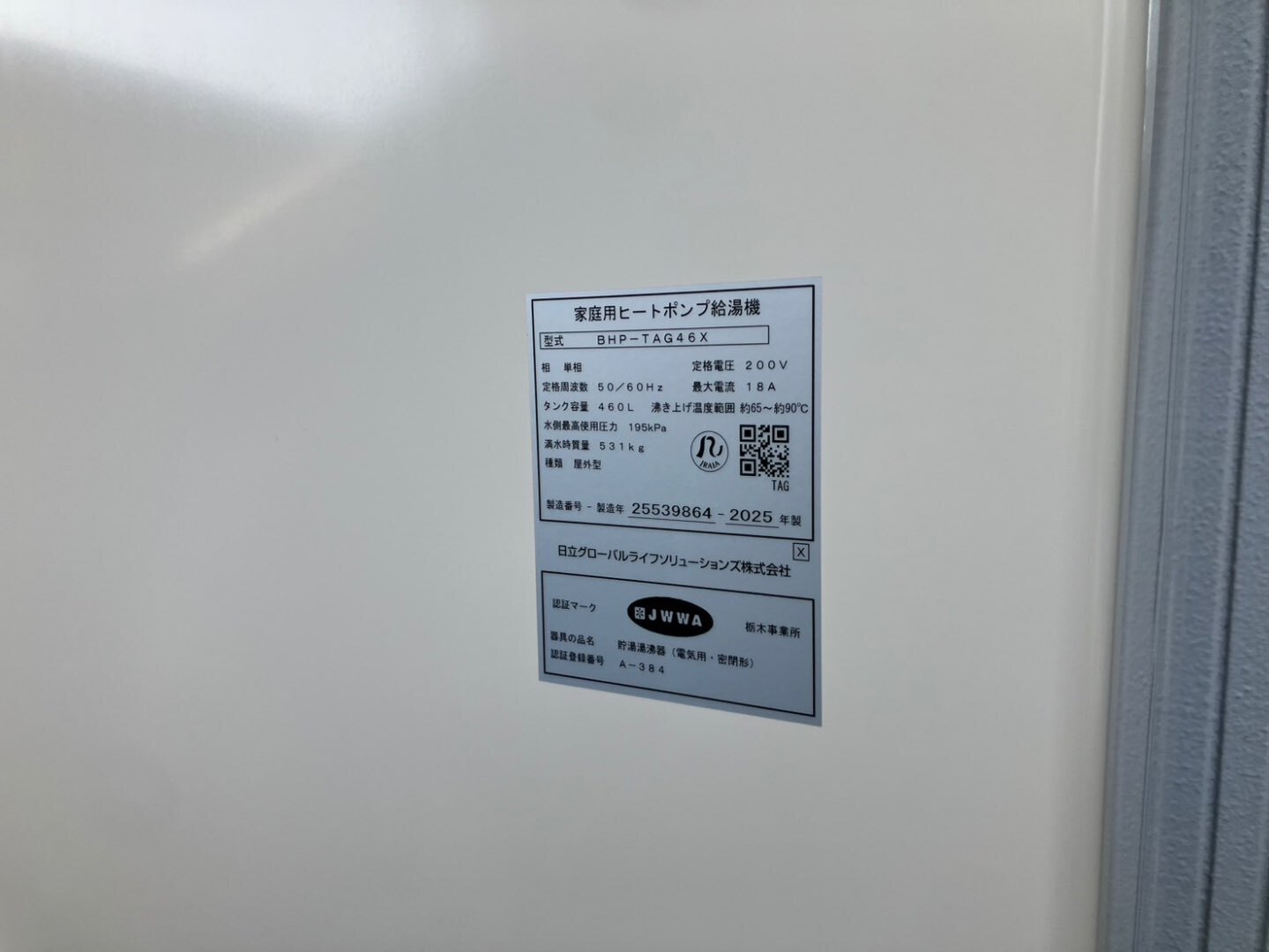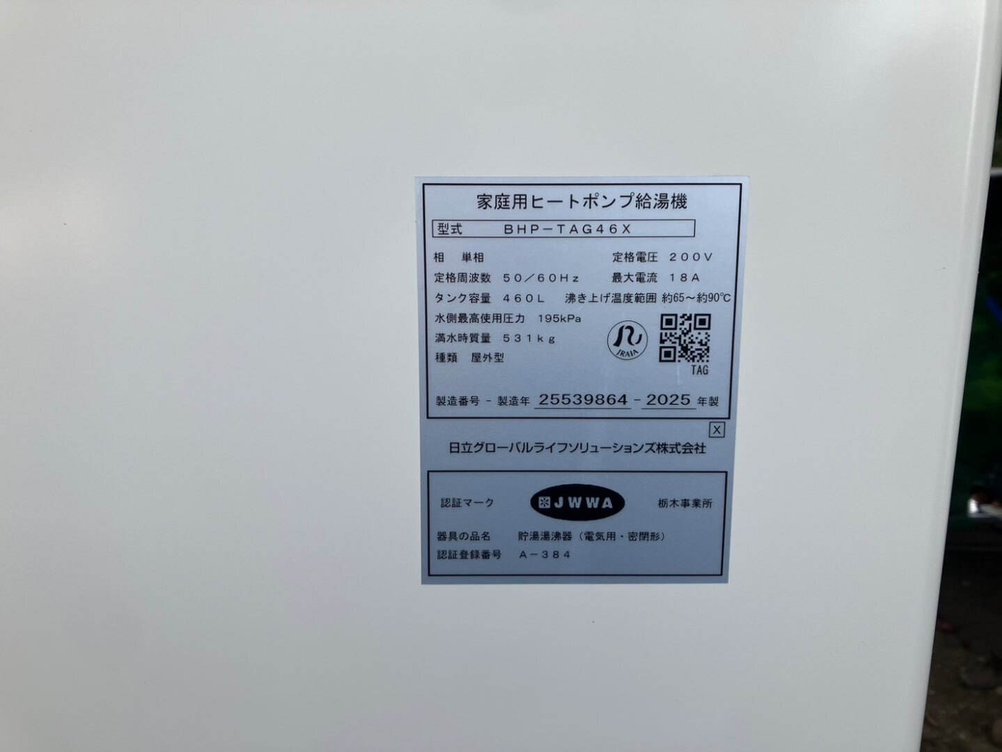 今回新設したのは、日立製の家庭用ヒートポンプ給湯機(エコキュート)460Lタイプです。