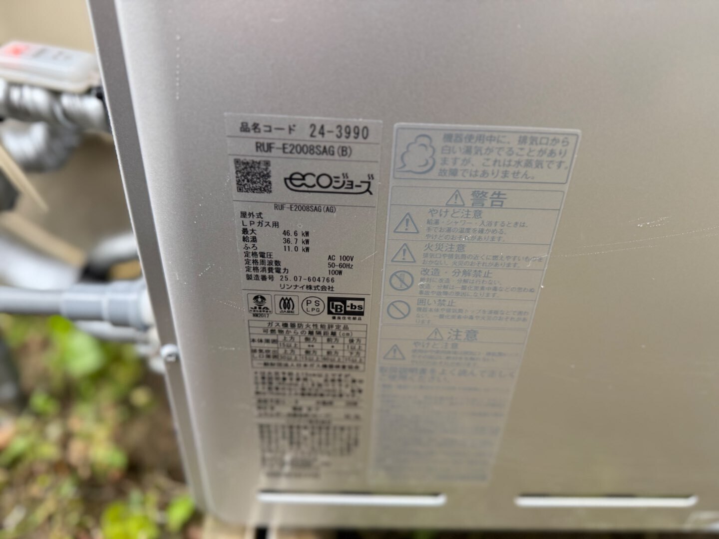 **リンナイ製 エコジョーズタイプのガス給湯器(戸建て向け20号)**です。
