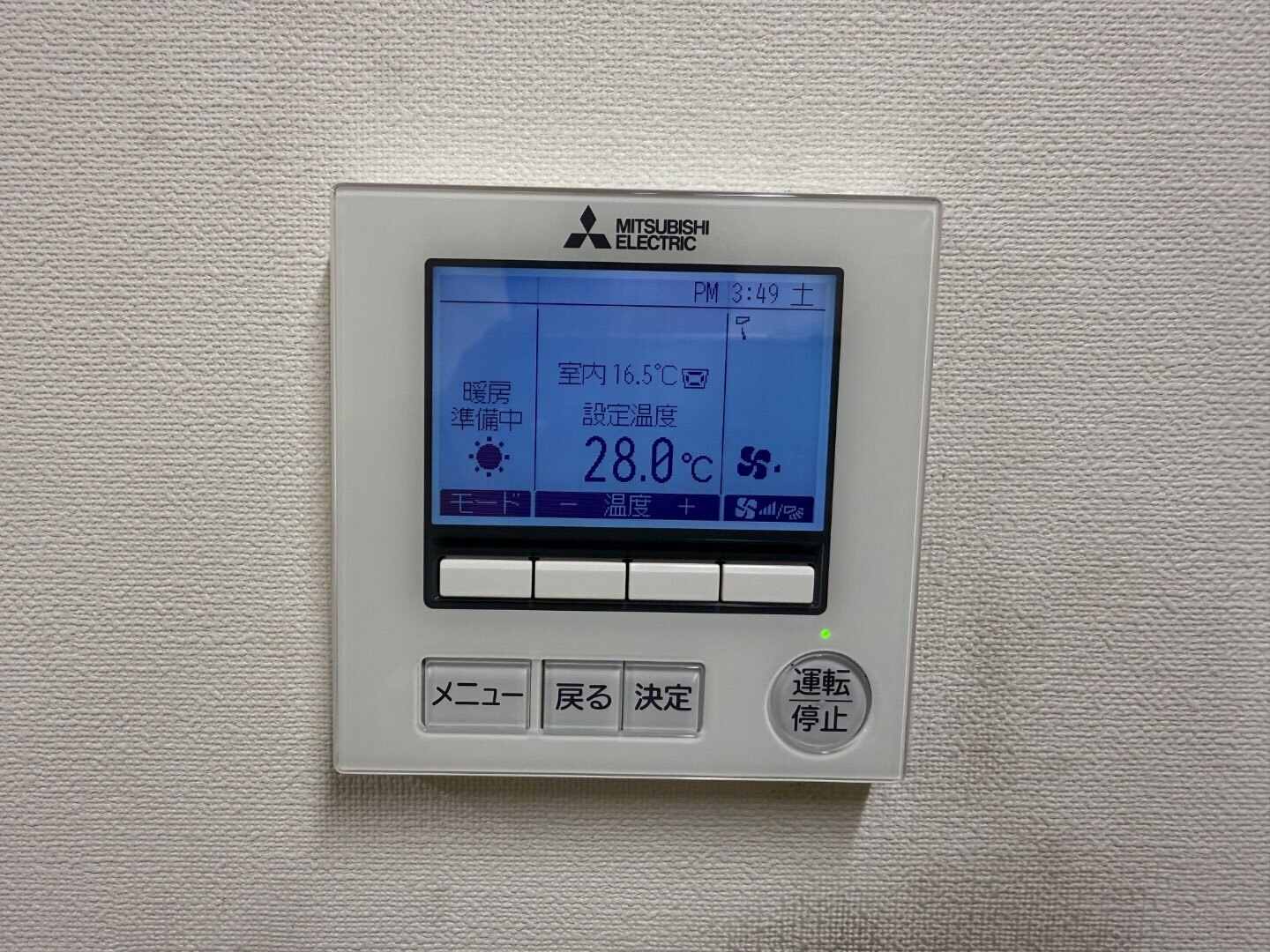 • 室内リモコンは見やすい位置に設置し、28℃設定で暖房運転を確認済み(室温16.5℃→上昇中)。