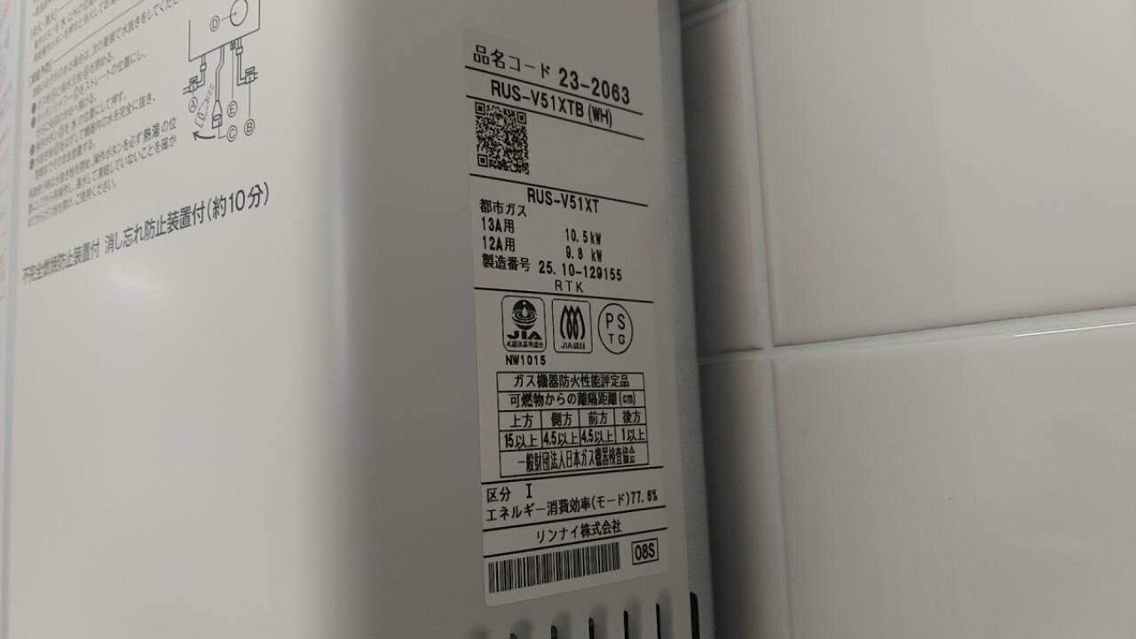 ■ 設置した機器:リンナイ RUS-V51XT(都市ガス 13A用)