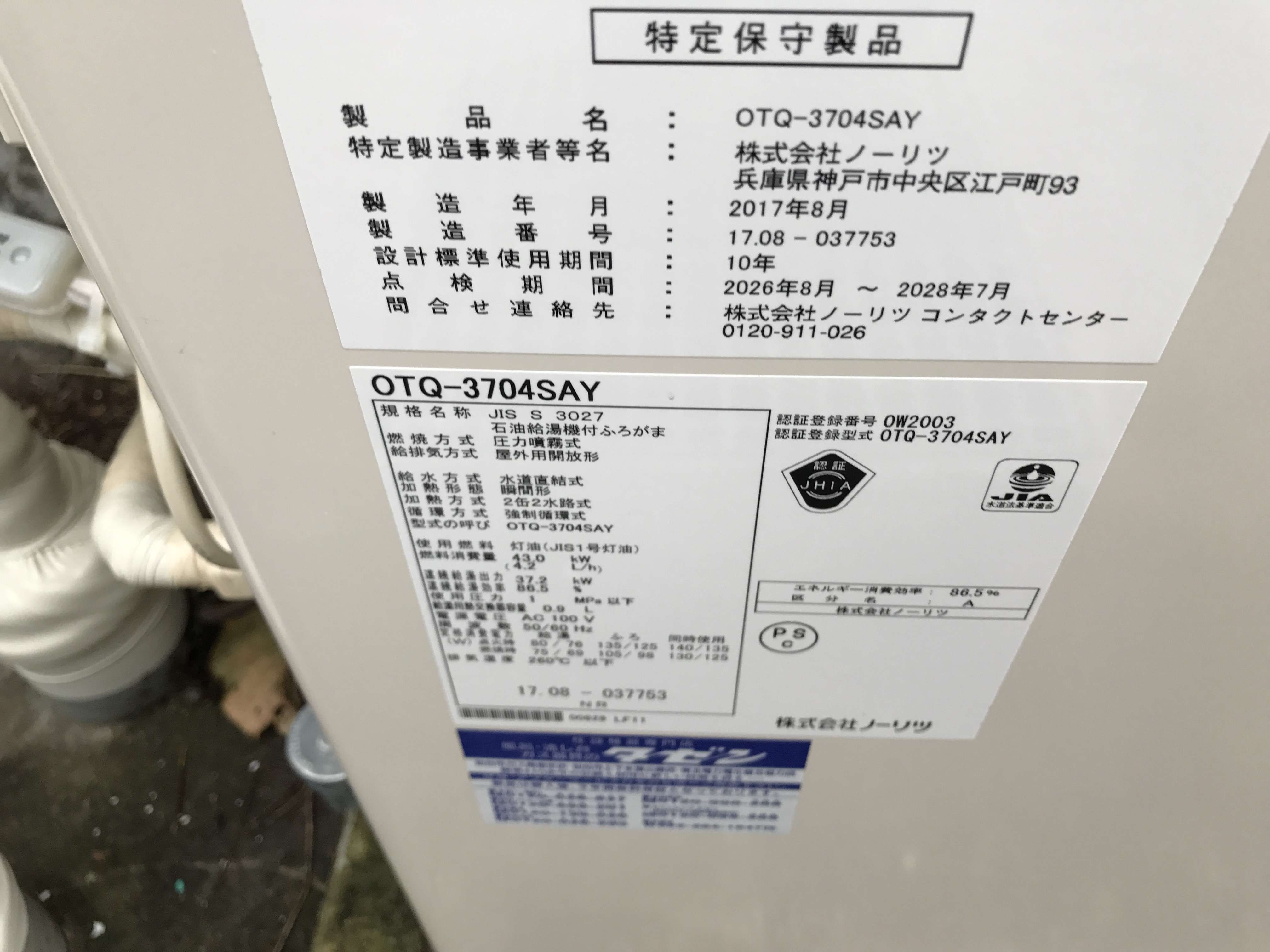 ノーリツ製 石油風呂給湯器。