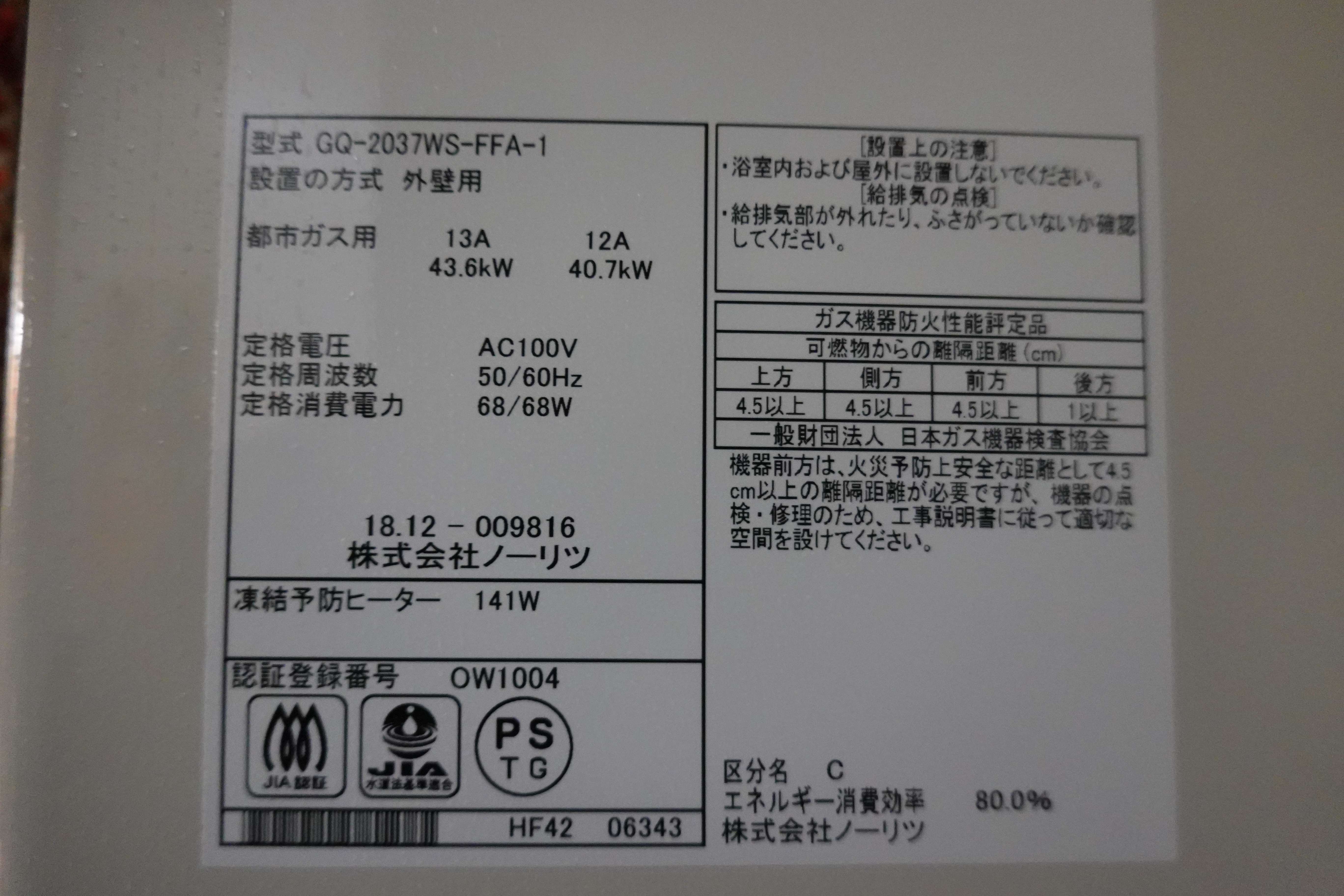 ノーリツ製 FF式 ガス給湯器交換交換工事