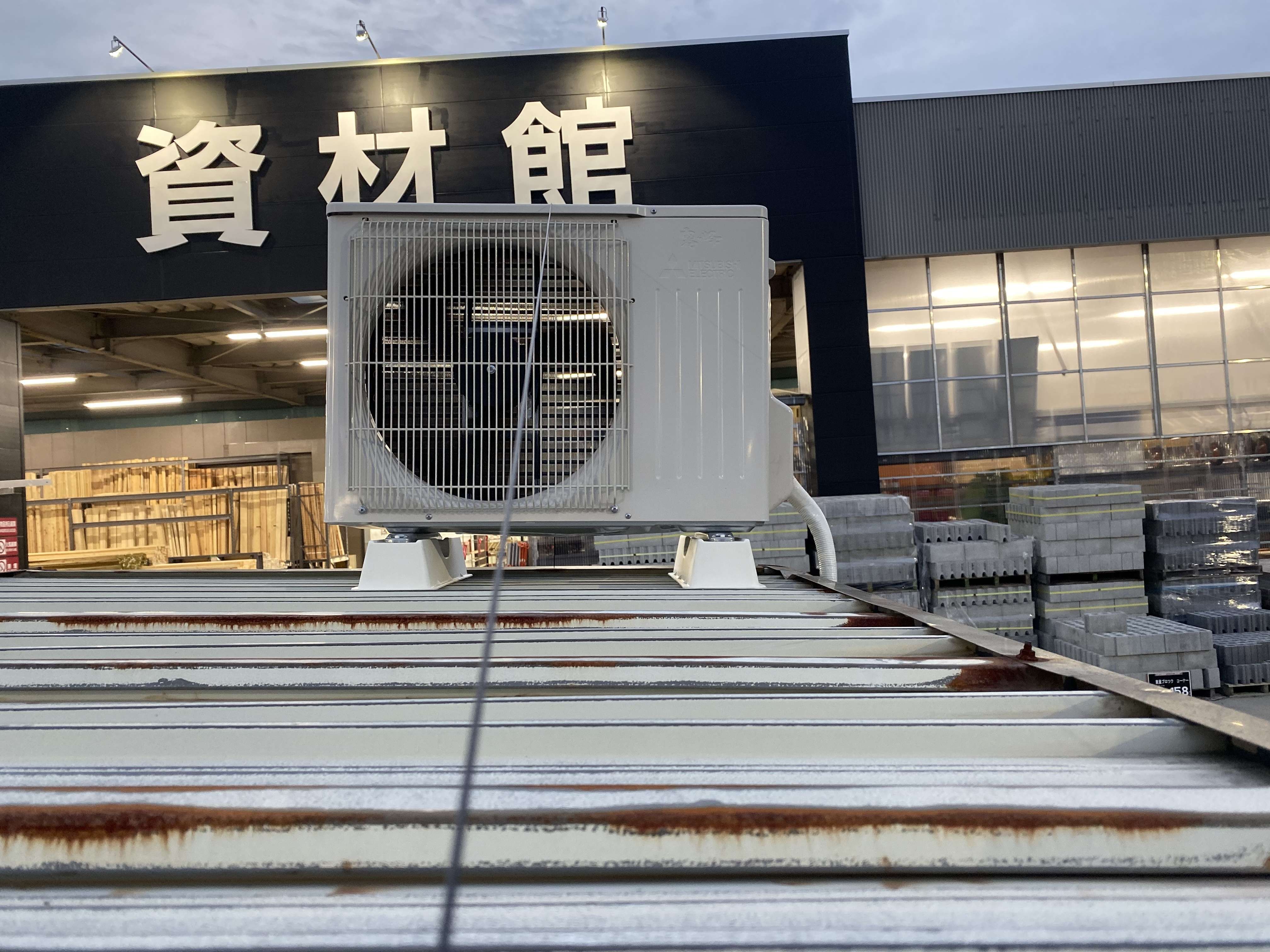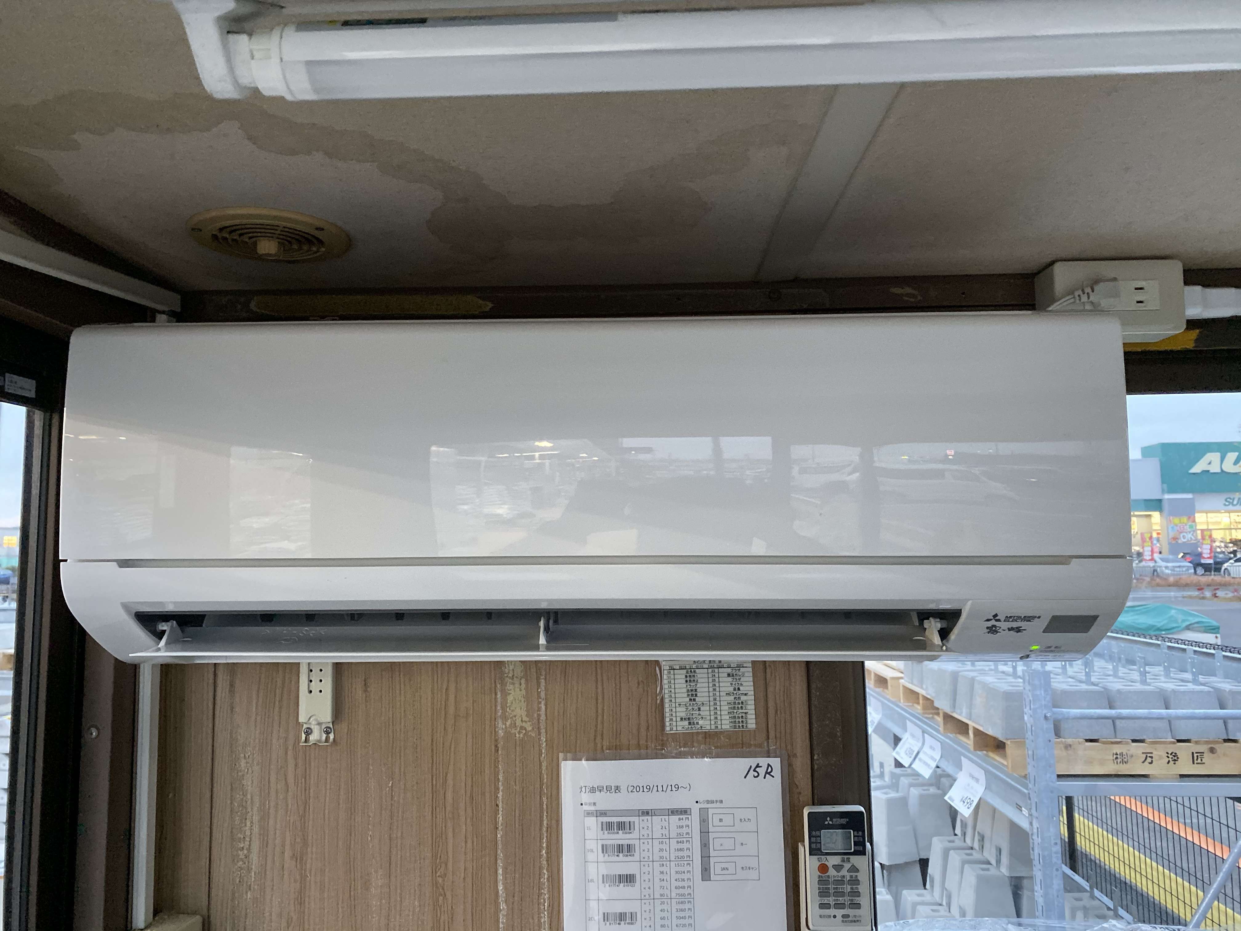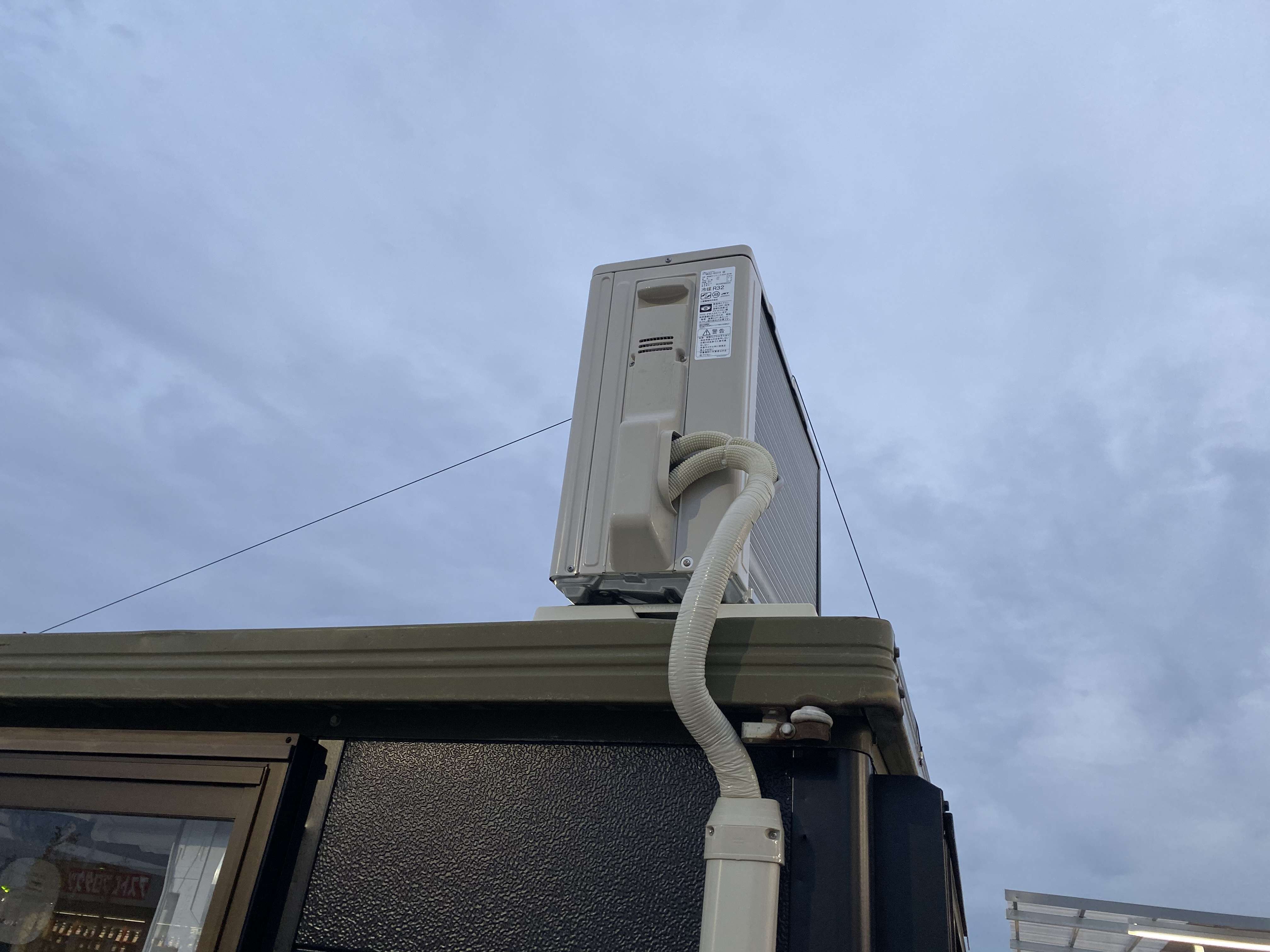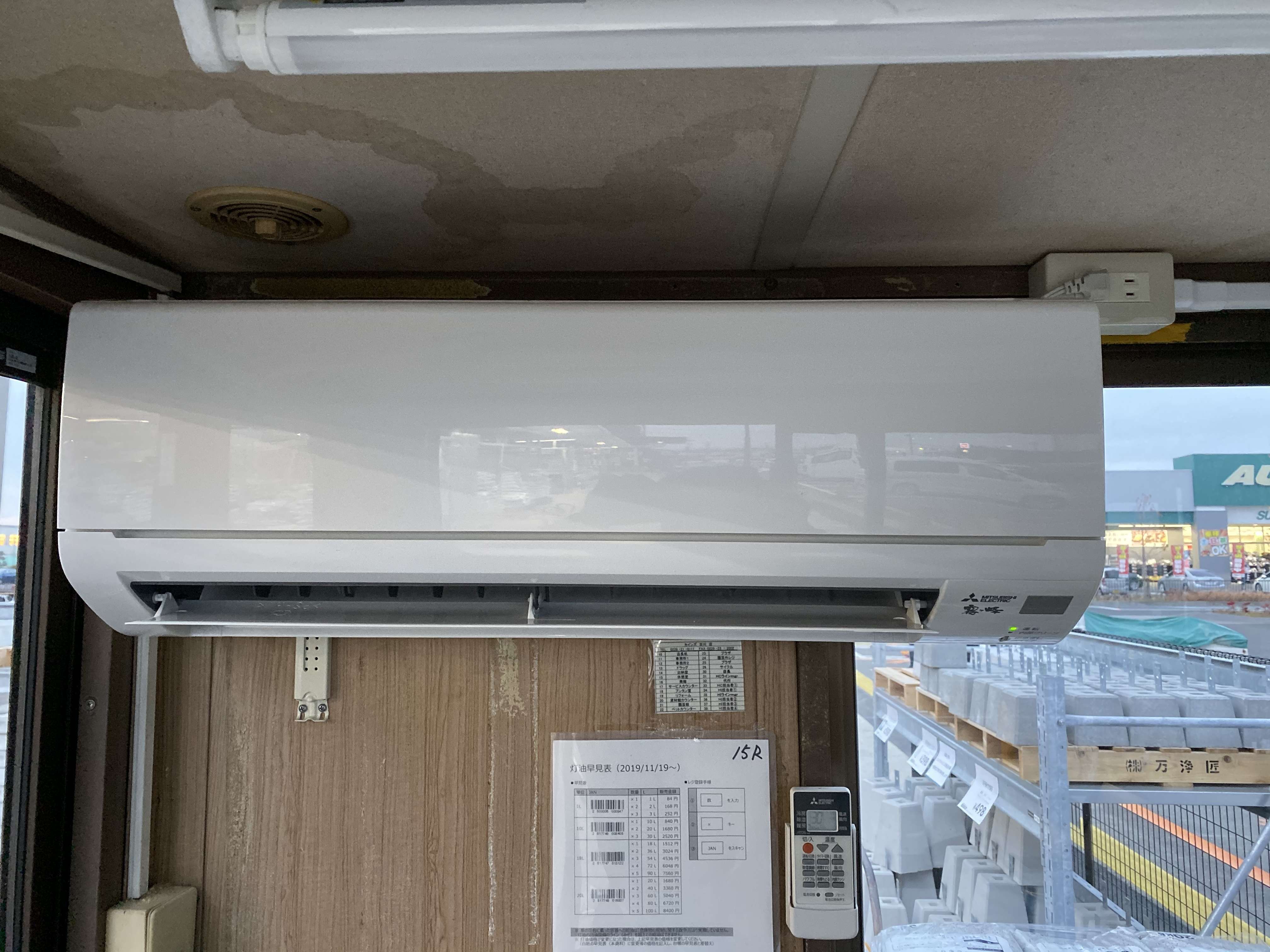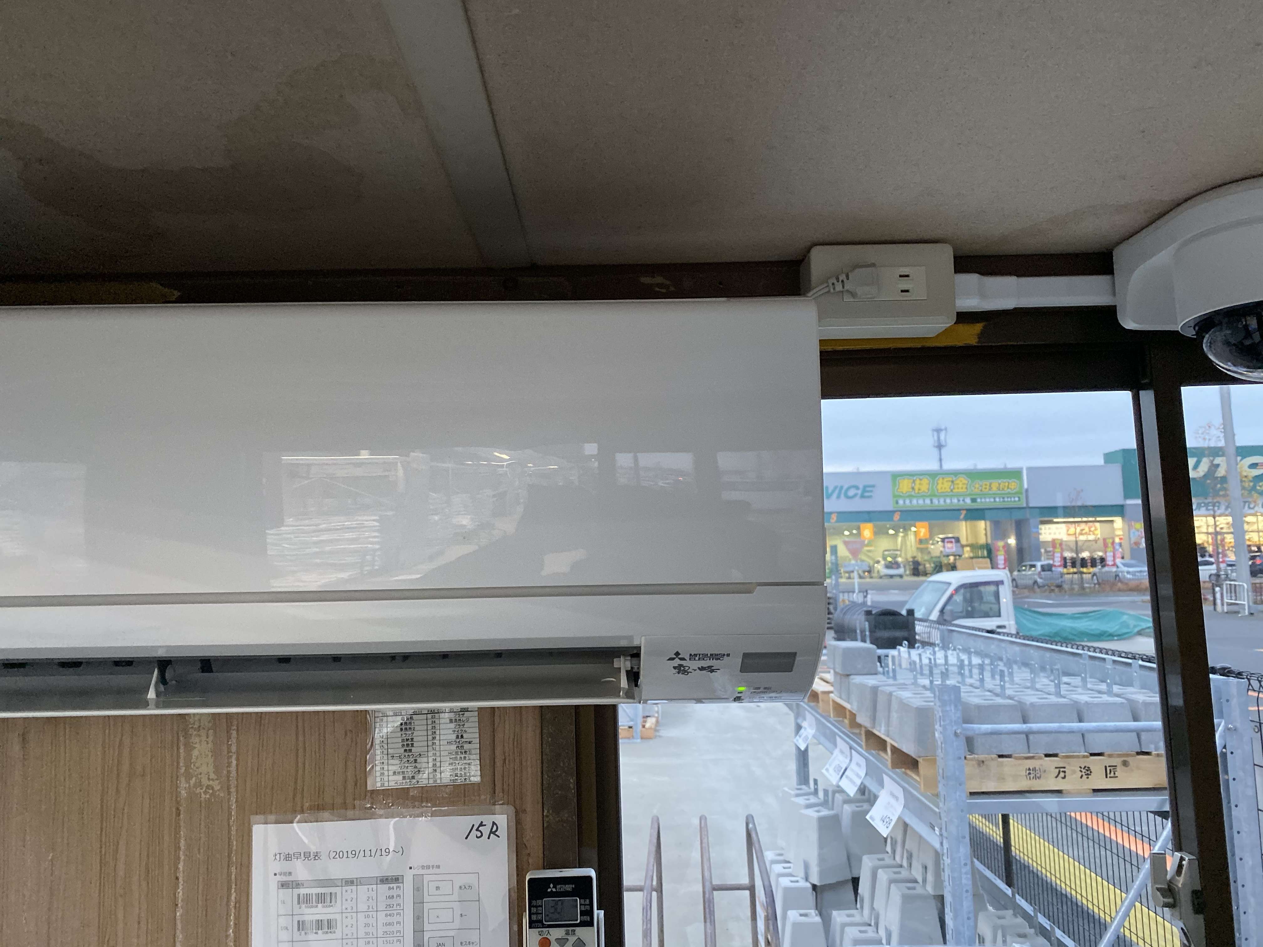 宮城県大崎市古川 店舗レジプレハブ小屋 三菱電機ルームエアコン取付工事