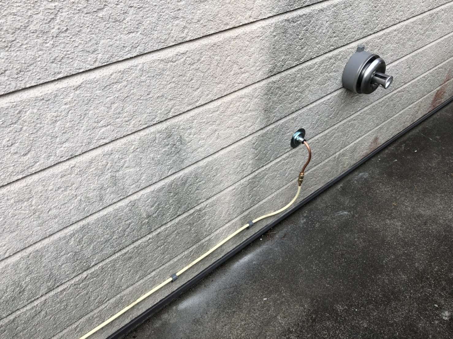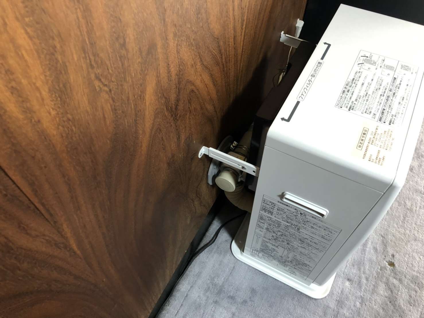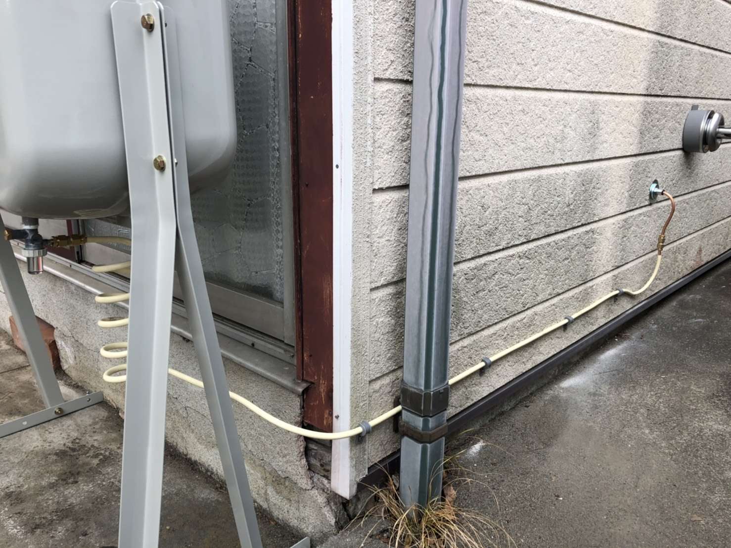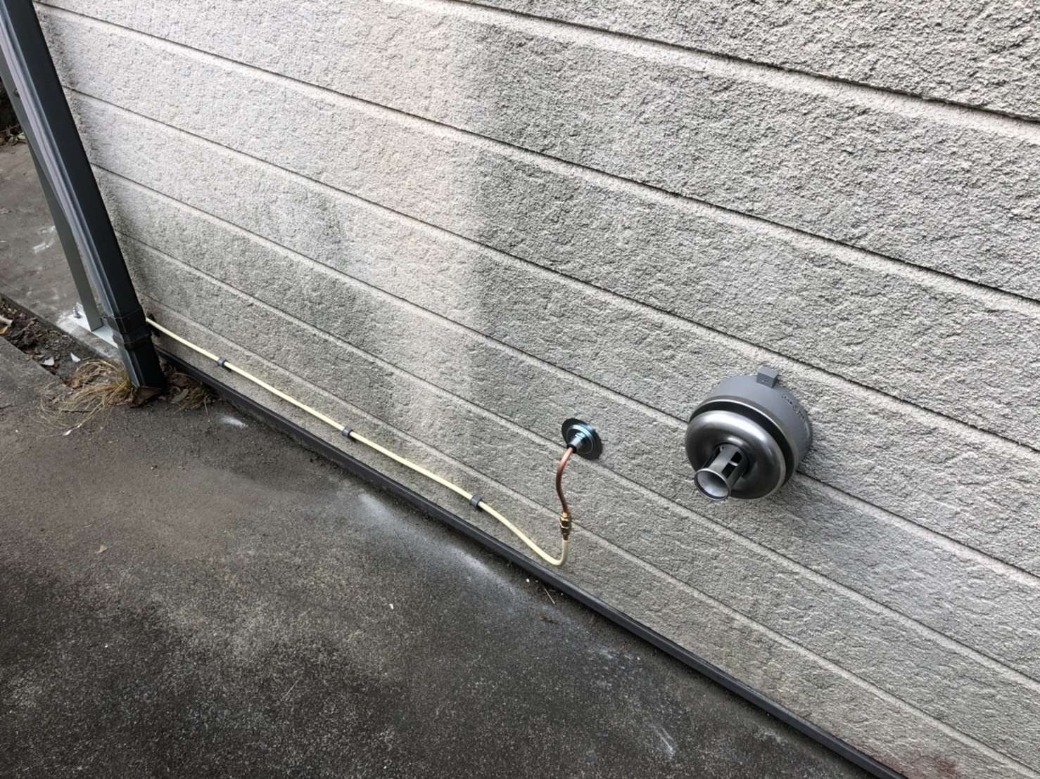 設置場所は、一軒家の1階の角部屋です。木造。壁に穴開けで排気を外部に出す口を設置。南面がテラスになっているので、ホームタンクをアンカーにて固定(通常の転倒防止的なもの)。