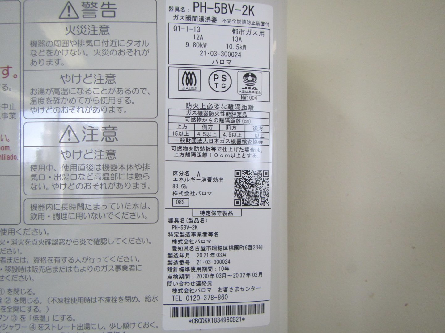 7.新規機器情報 パロマ製 元止め式ガス瞬間湯沸かし器。