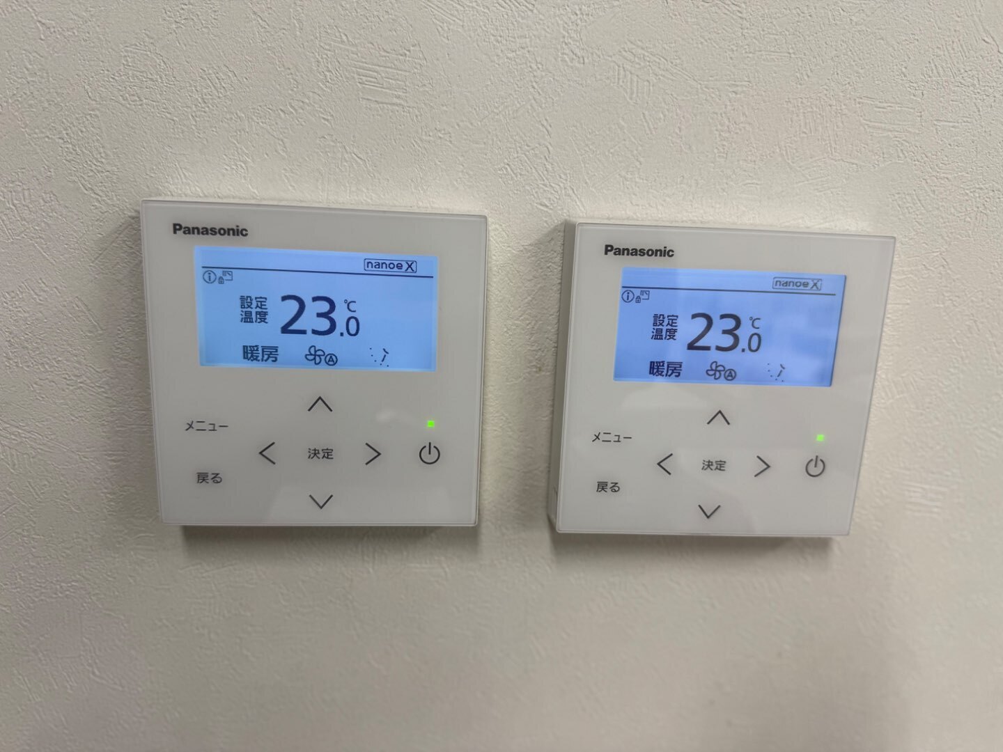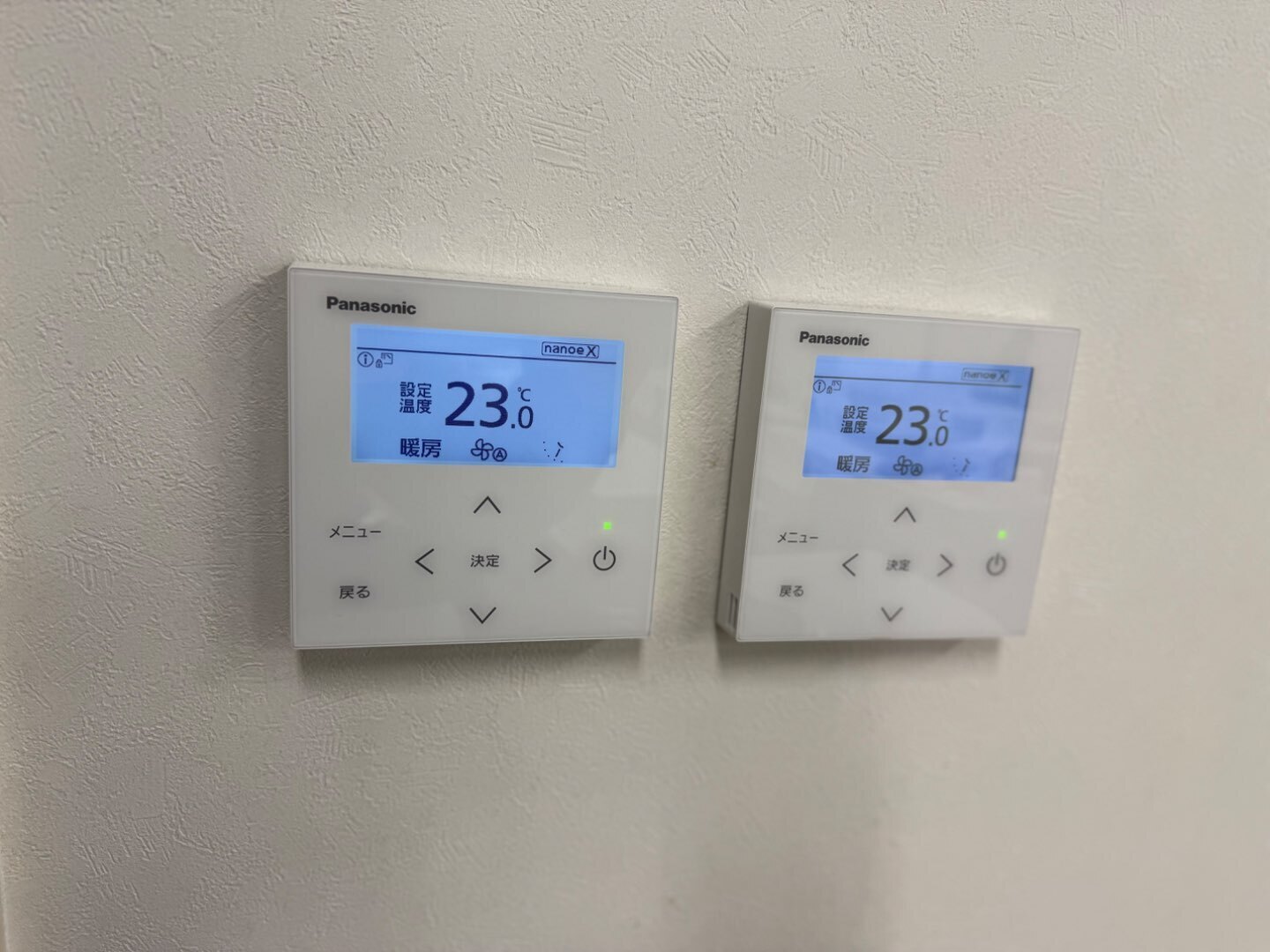 壁面にはパナソニックの ワイヤードリモコンが2台 設置されており、