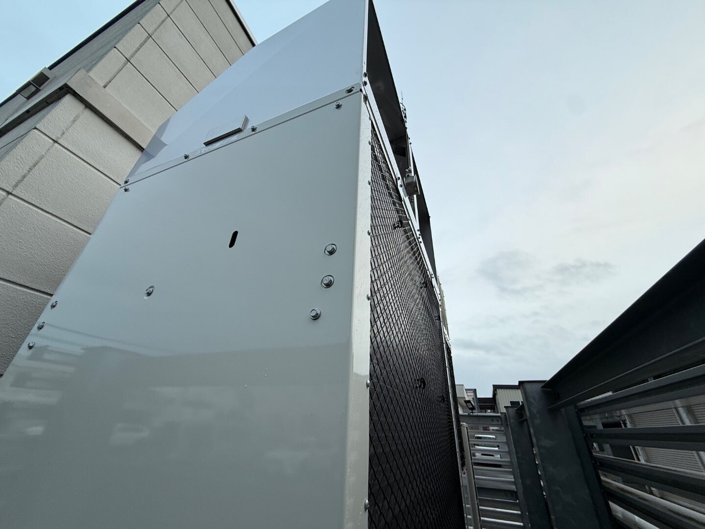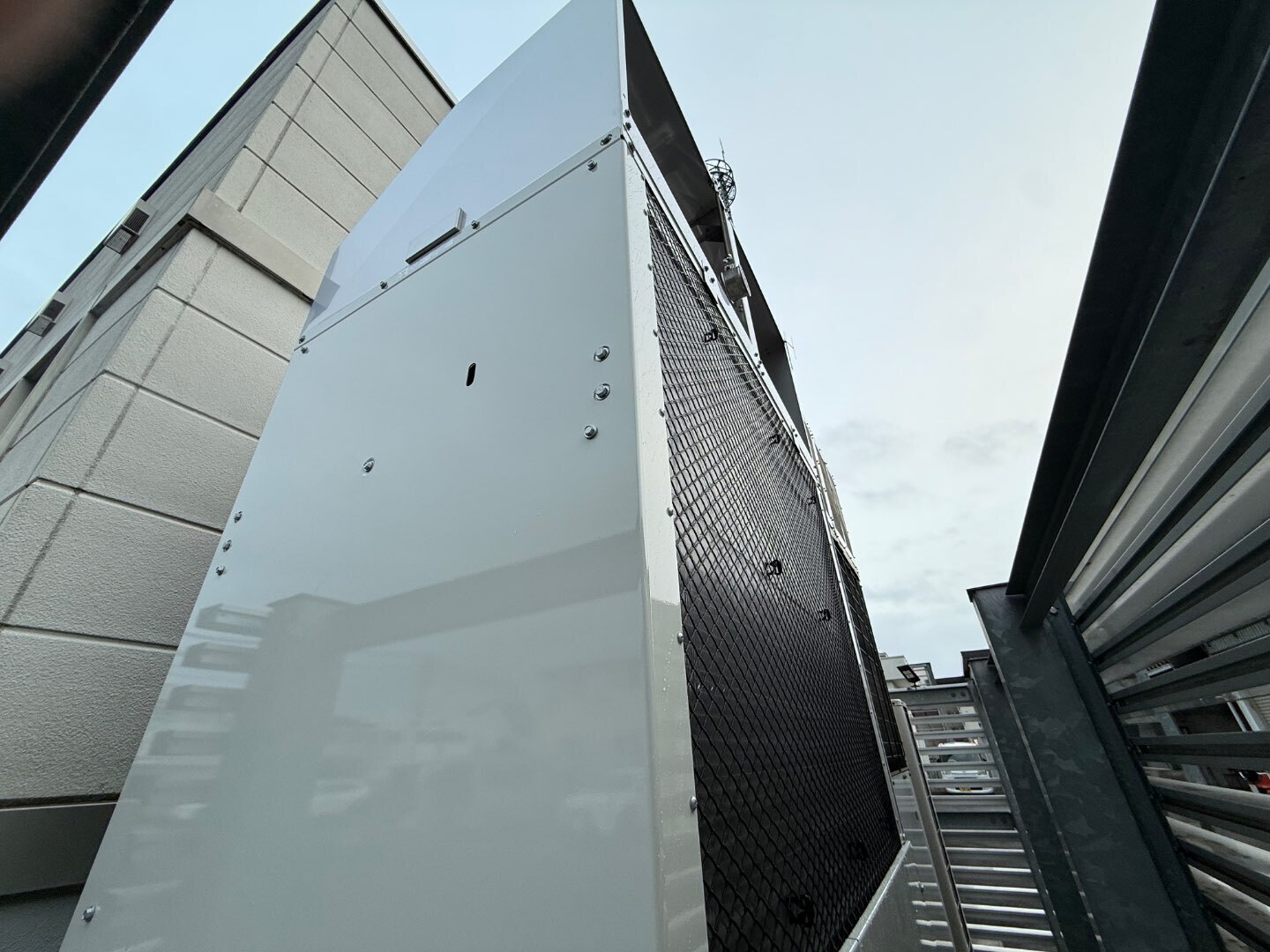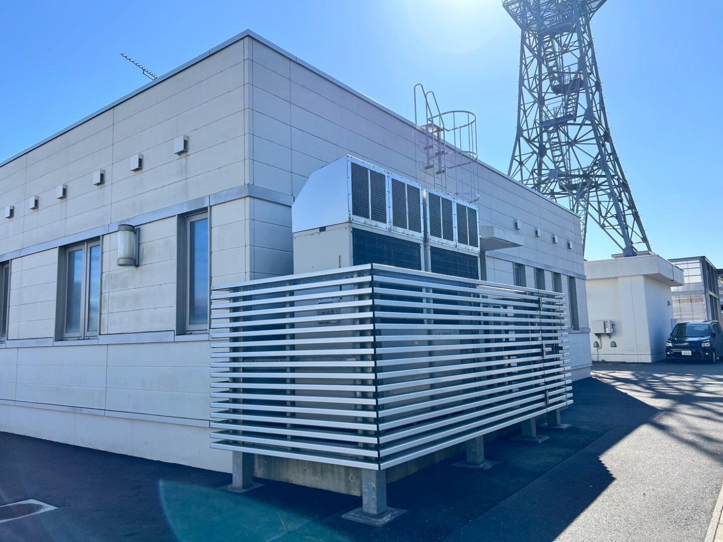 機器を保護するだけでなく、施設全体の景観を損なわないよう、建物デザインとの調和も重視した施工としています。