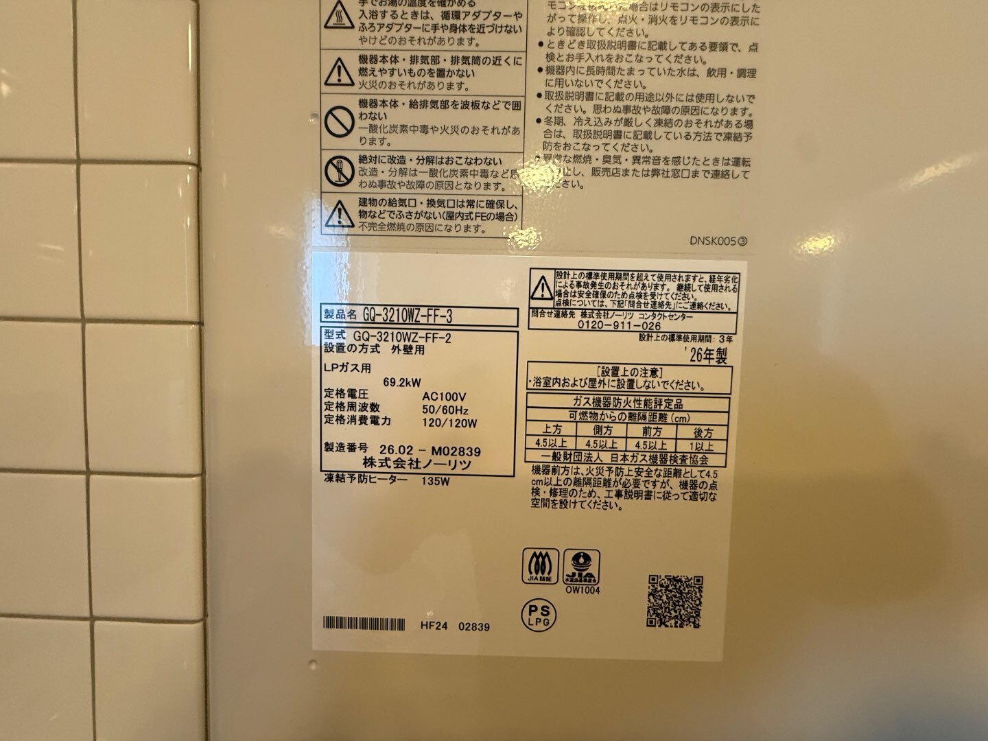ノーリツ製 FF式ガス給湯器 更新工事(NORITZ GQ-3210WZ-FF)