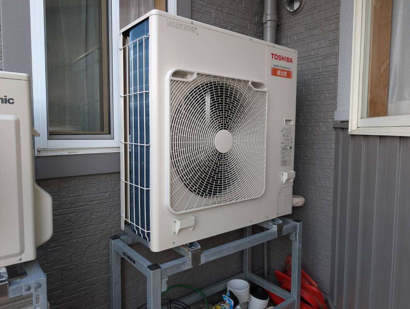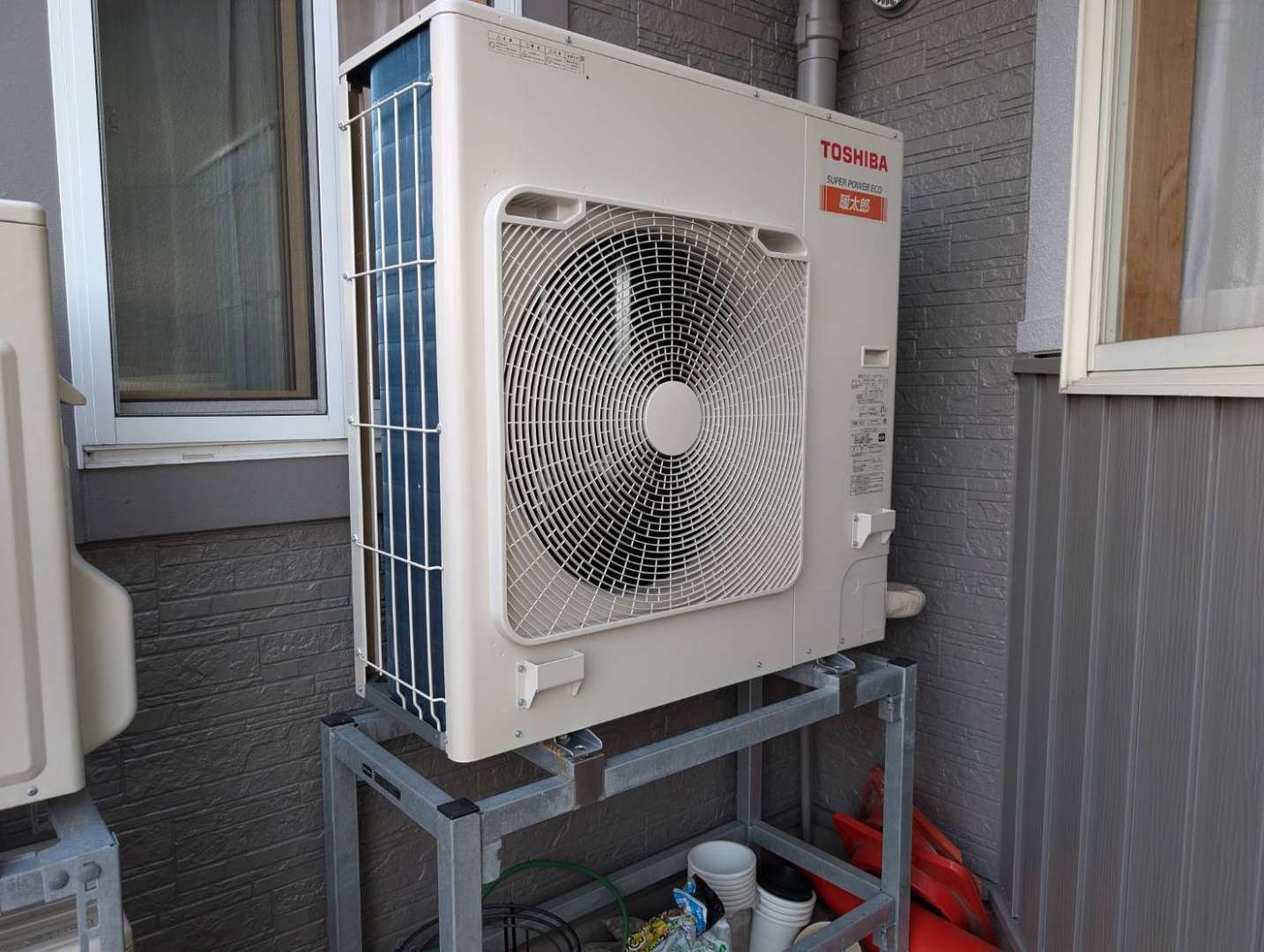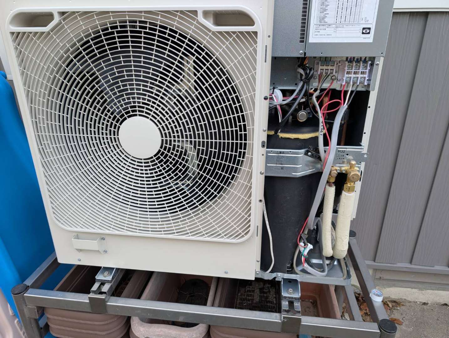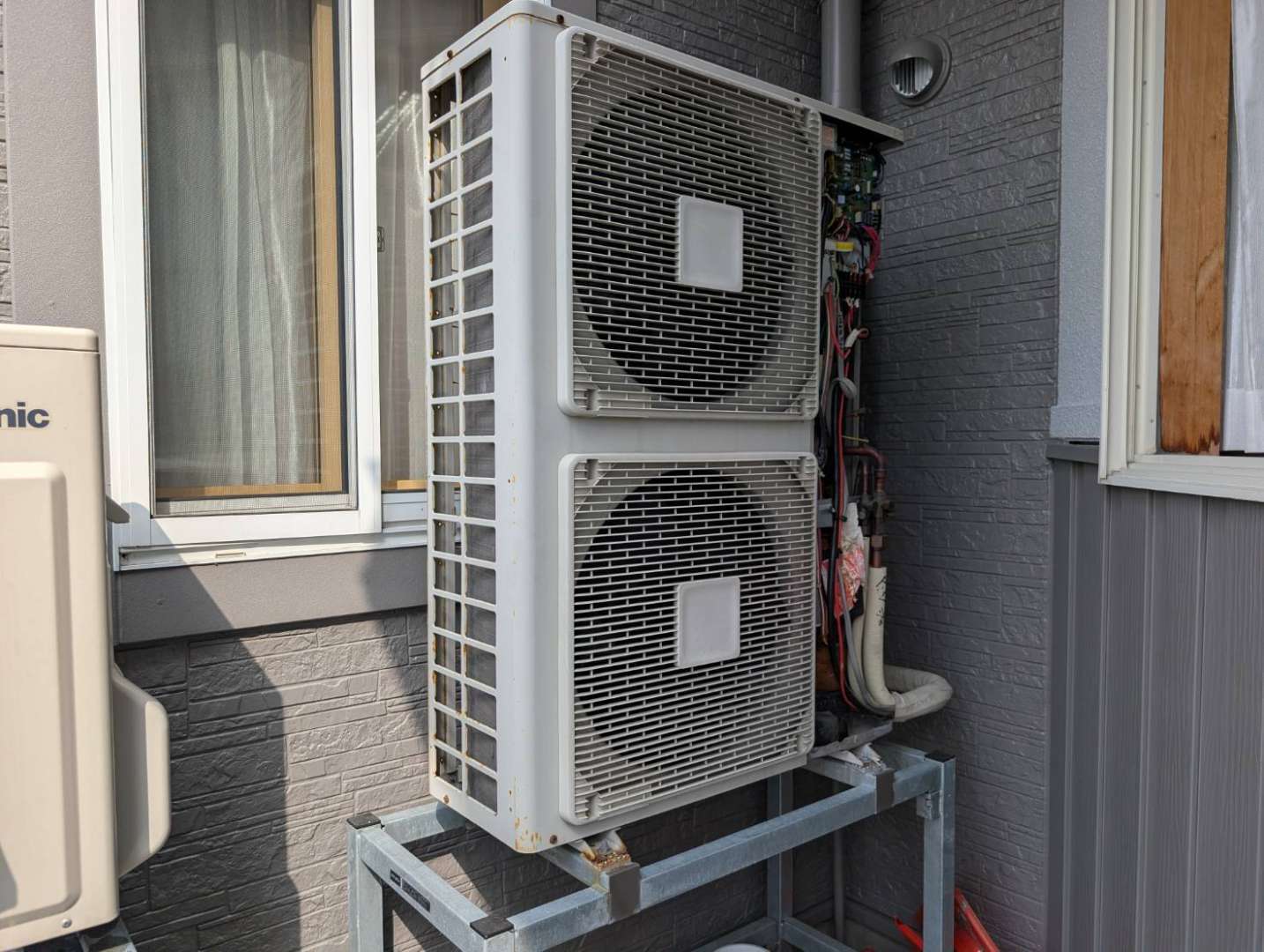 撤去後には、既存架台の状態や据付条件を確認し、新設機が安定して設置できるよう点検を行いました。室外機工事においては、機器本体だけでなく、架台の強度や水平、固定状態、周囲の通風条件が非常に重要です。特に室外機は運転時に振動を伴うため、設置のわずかな不具合が異音や振動増大の原因になることがあります。さらに、周囲の空気の流れが悪いと熱交換効率が低下し、十分な能力を発揮できないばかりか、電力消費の増加や機器負担の増大にもつながります。今回も新しい室外機が本来の性能をしっかり発揮できるよう、設置位置や周囲の離隔を確認したうえで施工を進めました。