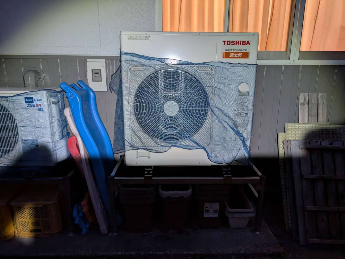 既設の室外機は架台上に設置されており、周囲には遊具や備品、収納物なども配置されている環境でした。そのため今回の工事では、ただ単に室外機を入れ替えるだけではなく、搬出入時の安全確保、周辺設備への配慮、設置架台の状態確認、配管ルートの確認、作業導線の確保といった点を丁寧に確認しながら作業を進めました。保育園施設では特に、通常の建物以上に周辺環境への配慮が求められます。園児の安全確保はもちろん、既存設備や建物外壁、窓まわりへの接触防止など、細かな点まで意識した施工が必要です。