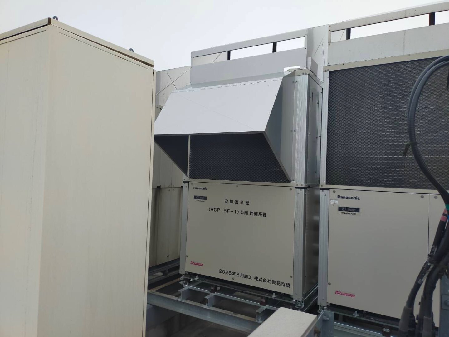 今回の工事では、既設のサンヨー製GHPから、パナソニック産機製GHPへの更新を実施いたしました。