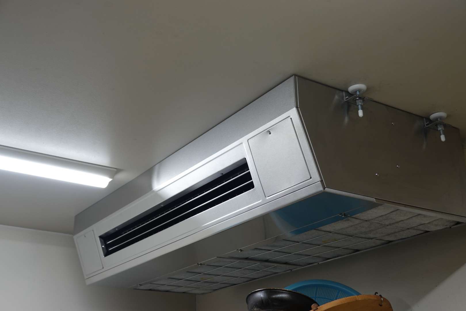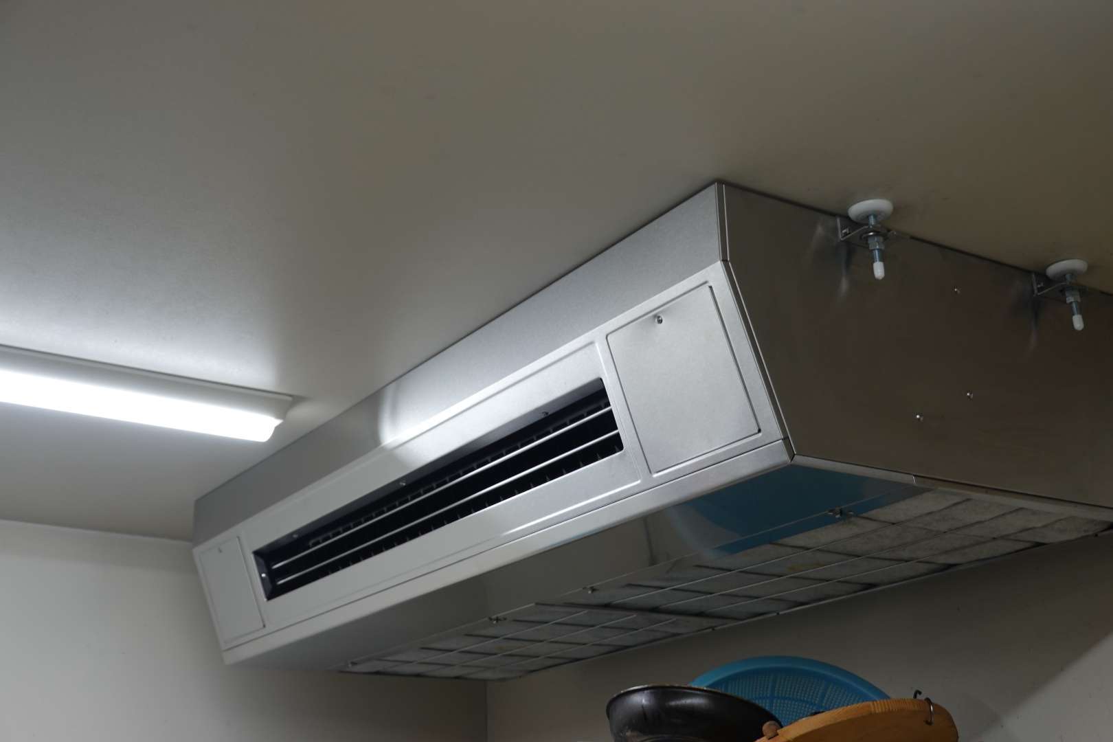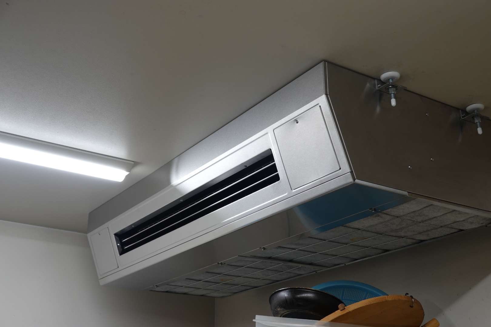 宮城県仙台市若林区 飲食店店舗様厨房内 パナソニック 厨房用天吊型業務用エアコン新規取付・新規動力電源配線工事