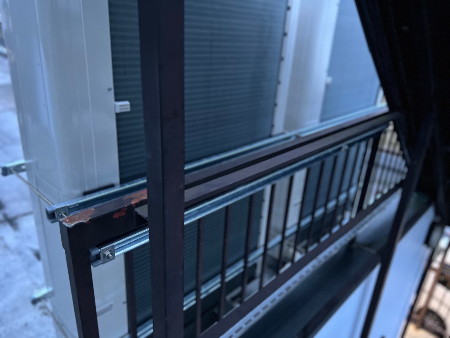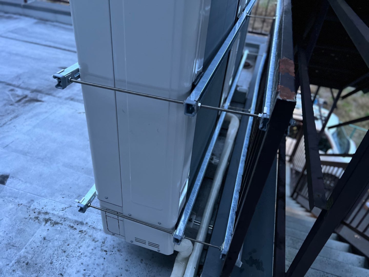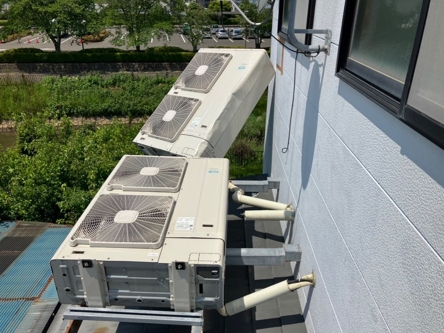 1.地震発生被害による既存空調設備機器室外機転倒・破損に伴う室外機交換工事。