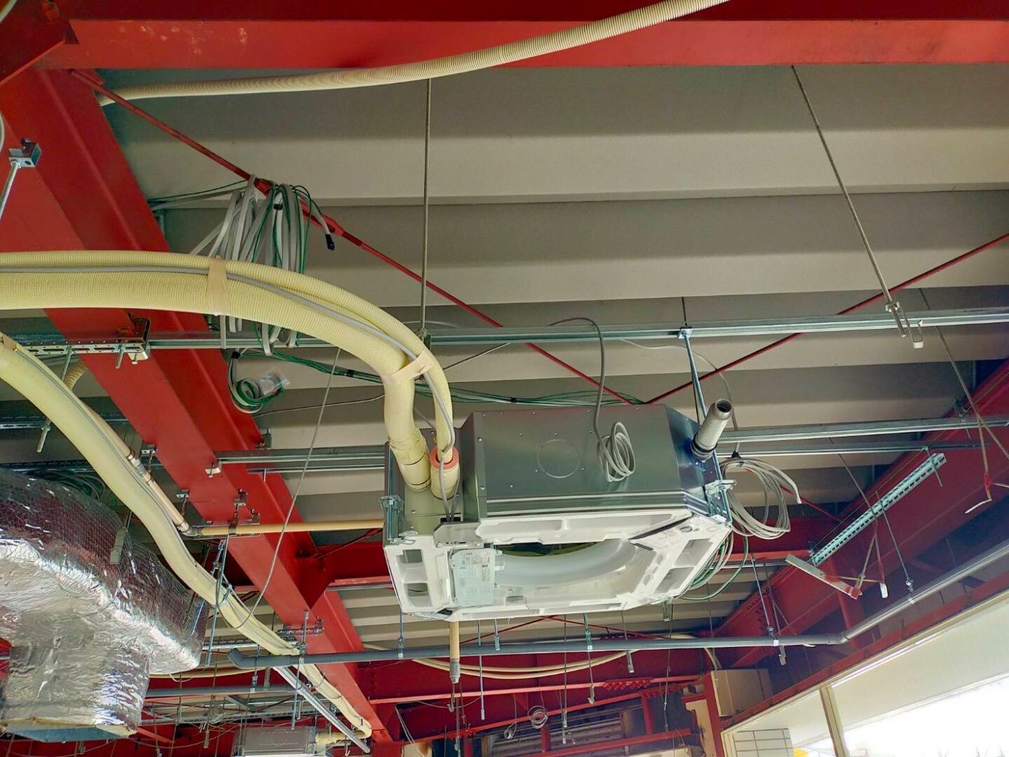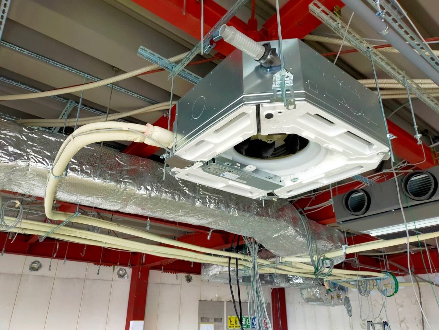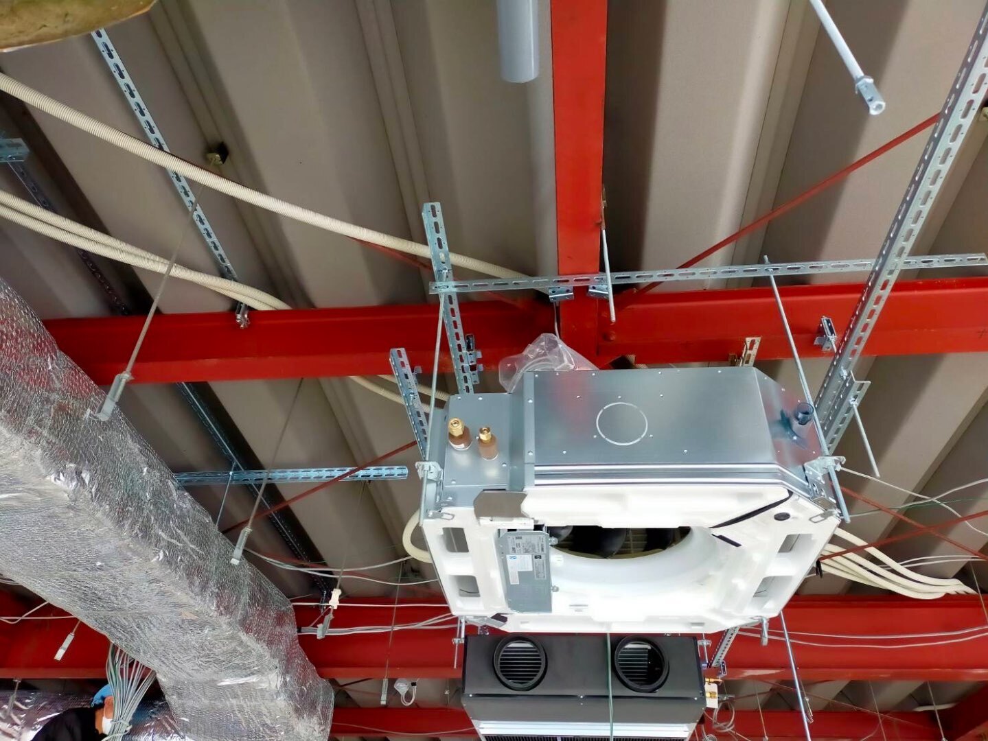 🏗【施工事例】大型施設 新設エアコン設置工事 天井カセット形4方向/気密試験・真空引き確認 新築倉庫(鉄骨造)内にて、業務用天カセ形エ…