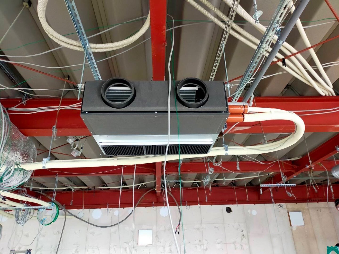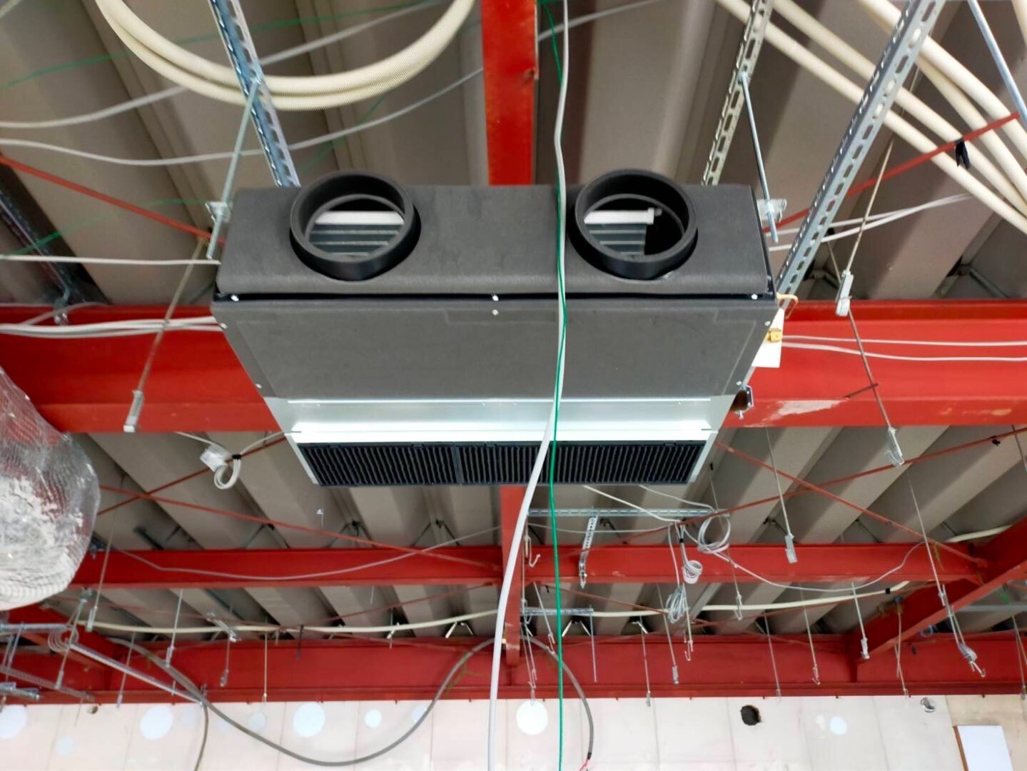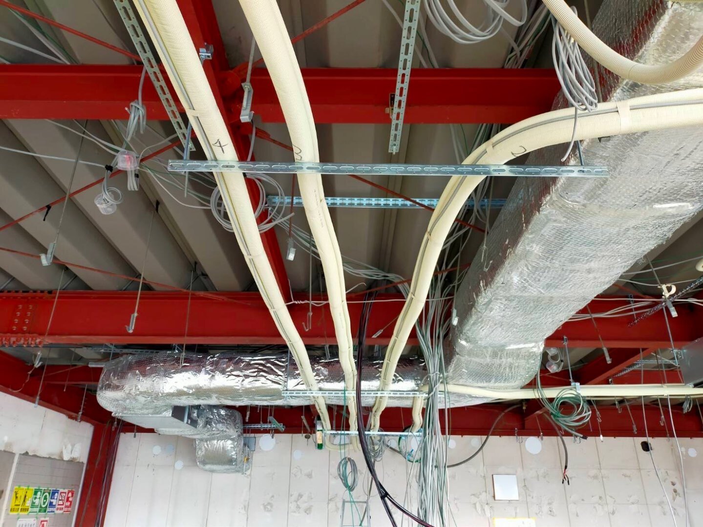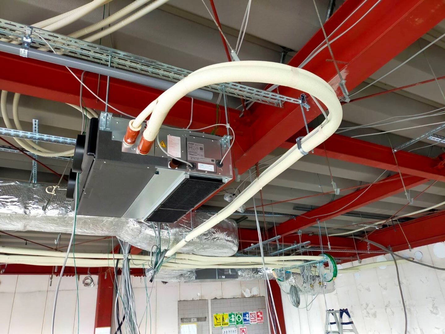 🏗【施工事例】大型施設 新設エアコン設置工事 天井カセット形4方向/気密試験・真空引き確認 新築倉庫(鉄骨造)内にて、業務用天カセ形エ…