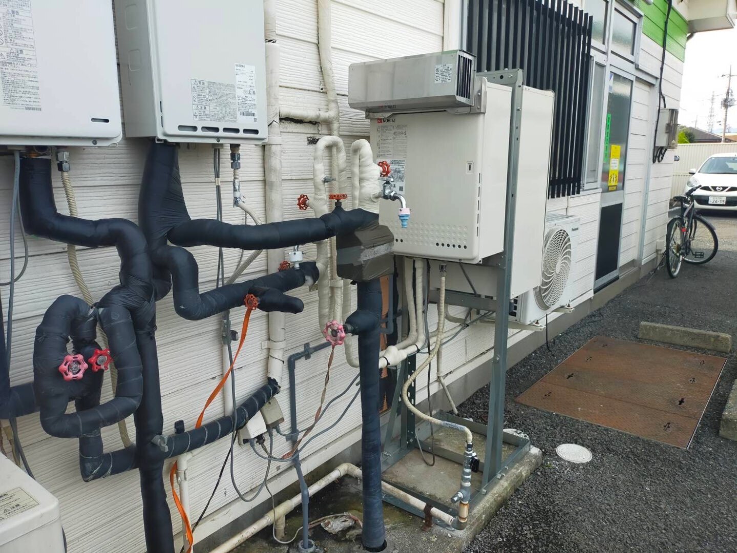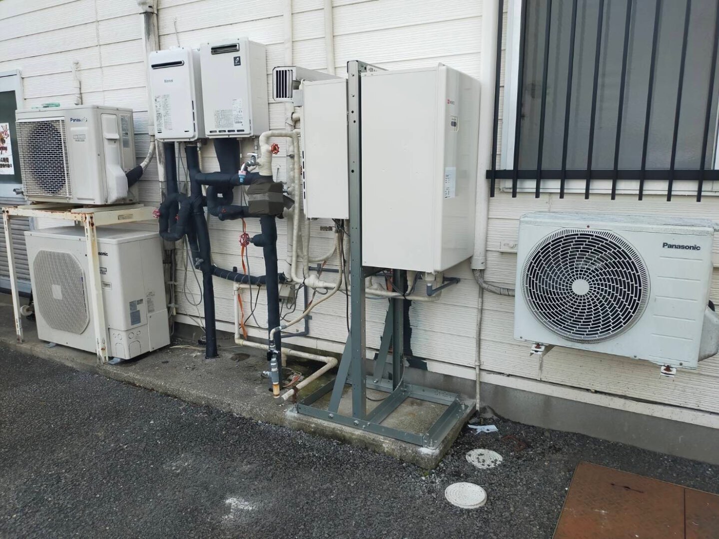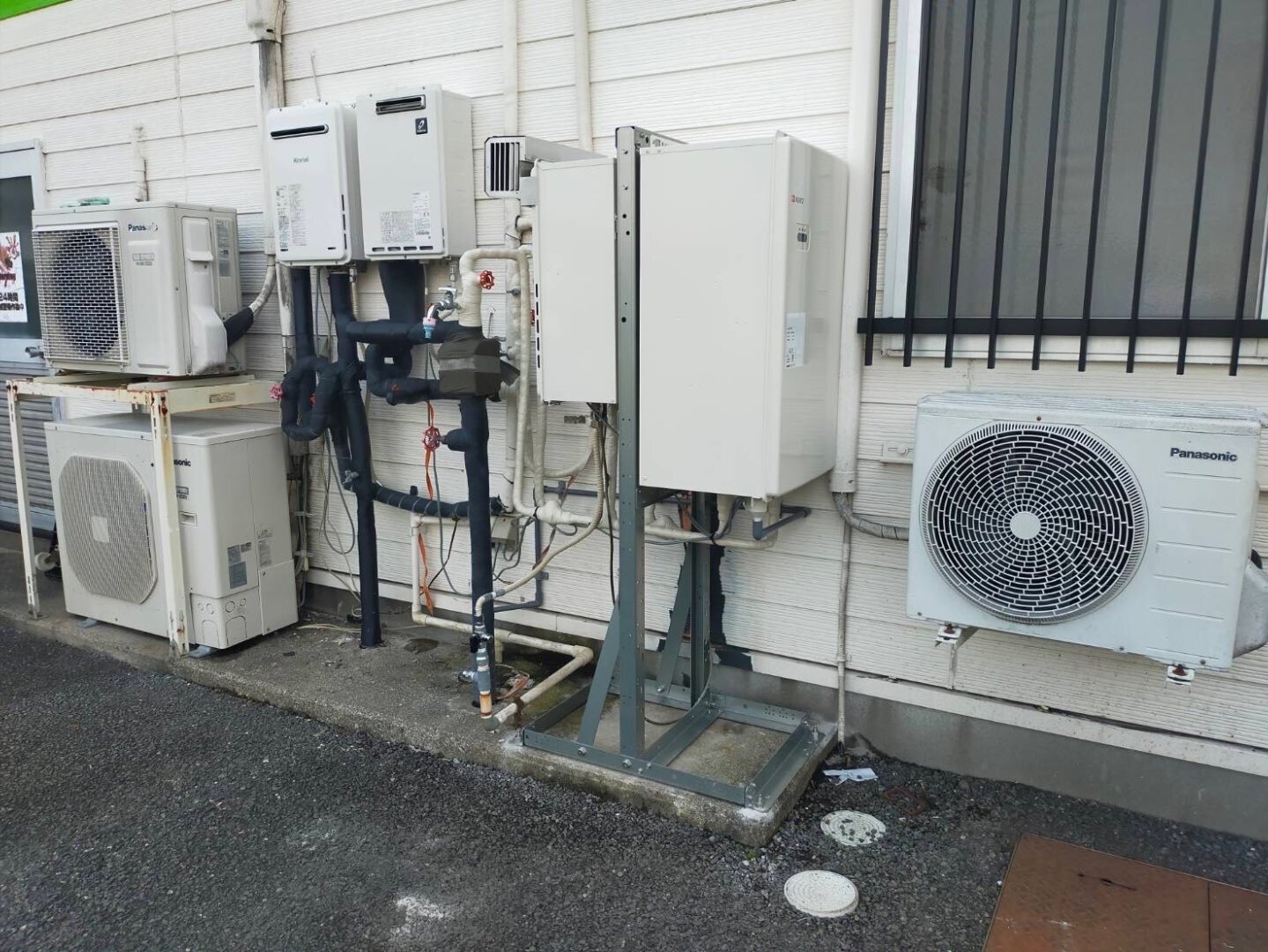 周辺には空調・エコキュート・給湯関連の複合配管が集約されており、店舗または施設の集中給湯設備と思われます。