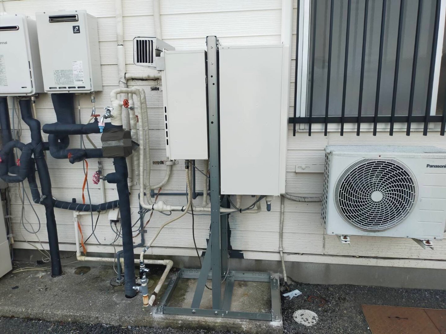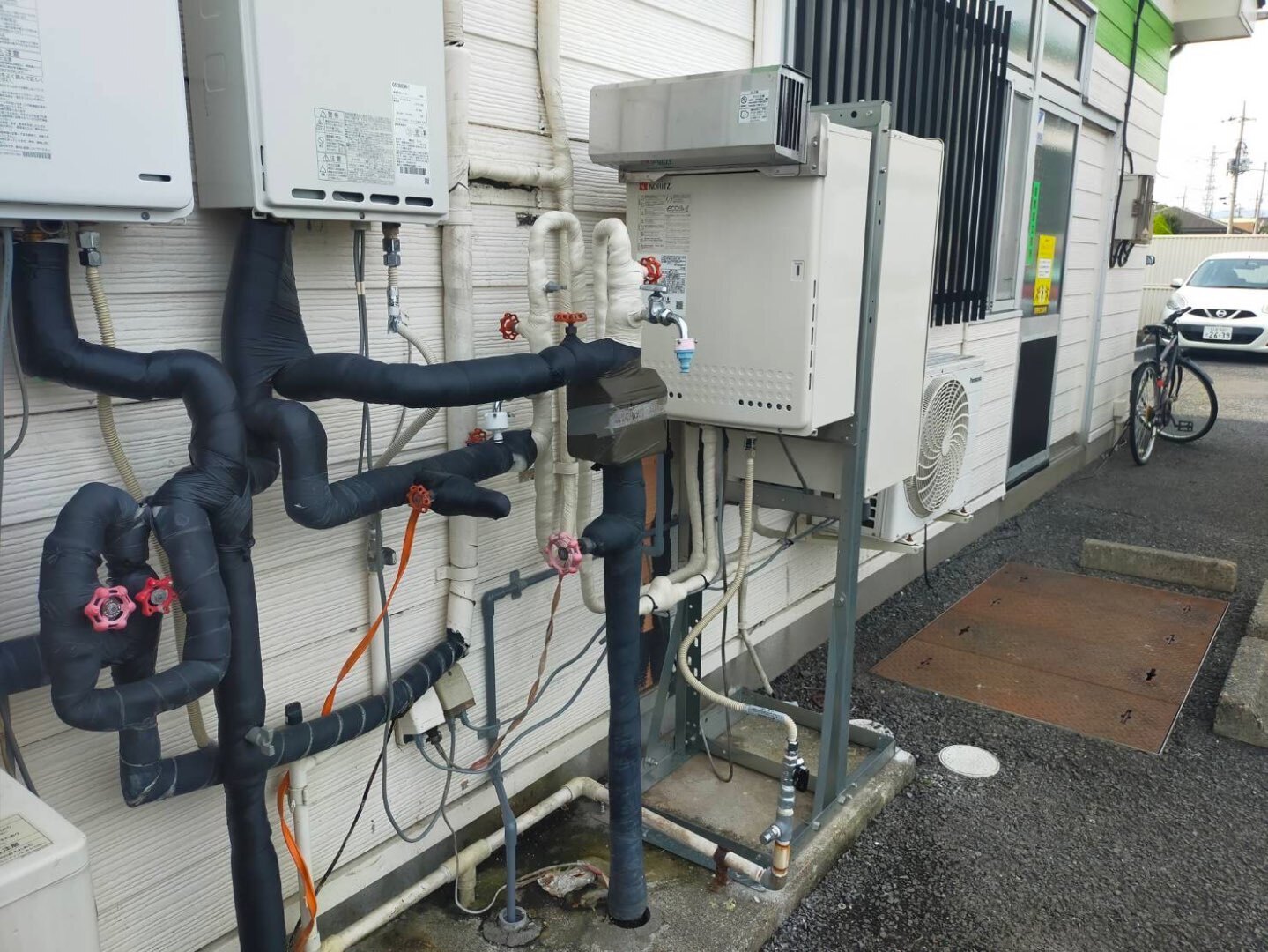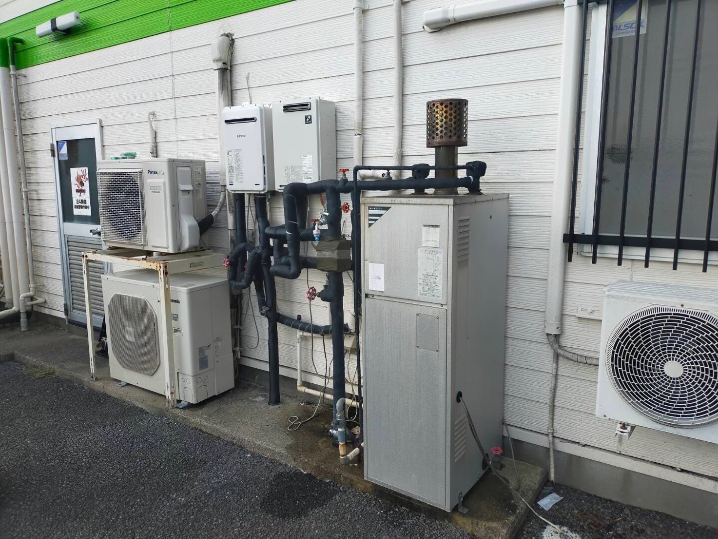 周辺には空調・エコキュート・給湯関連の複合配管が集約されており、店舗または施設の集中給湯設備と思われます。