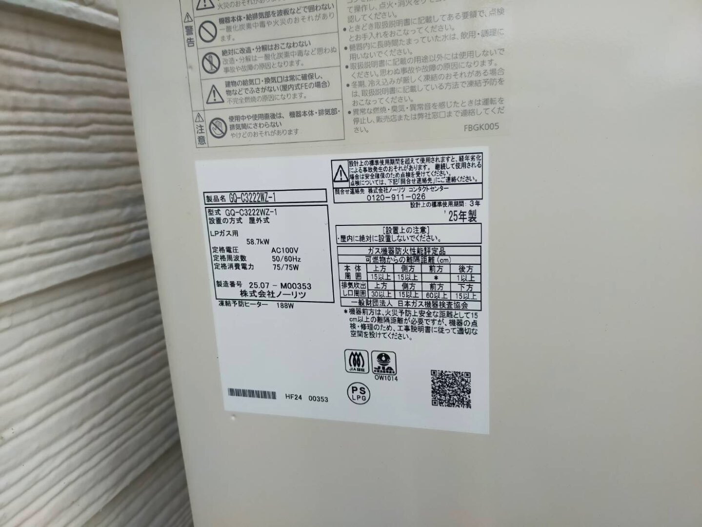 老朽化したガスボイラーを撤去し、最新の高効率ノーリツ製エコジョーズ給湯器(GQ-C3222WZ-1)へ更新いたしました。
