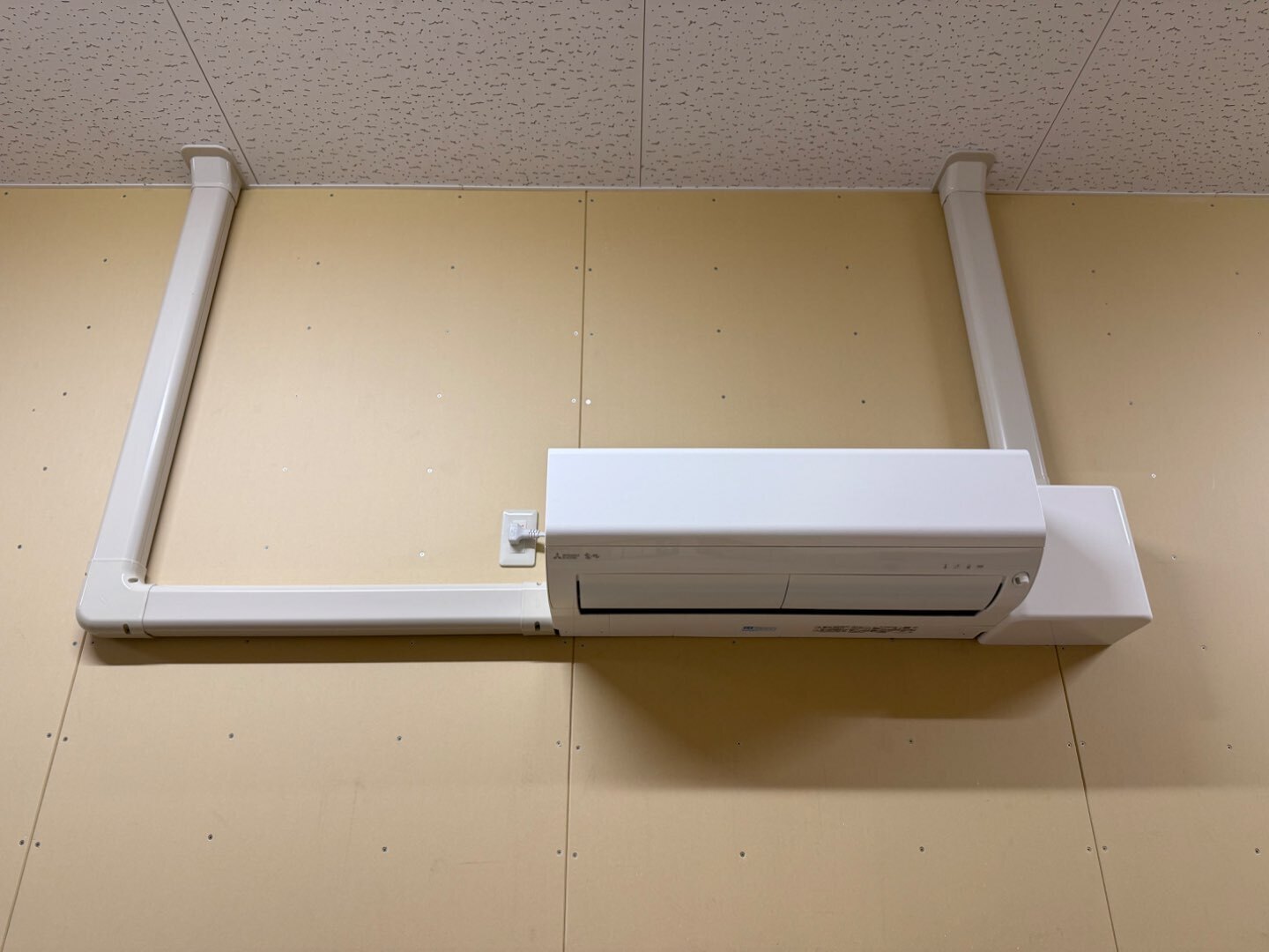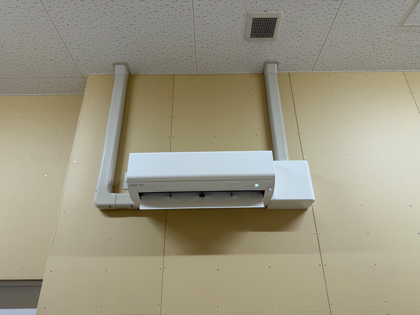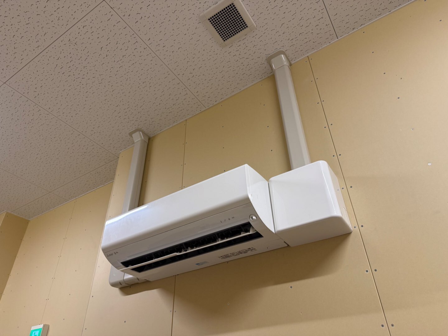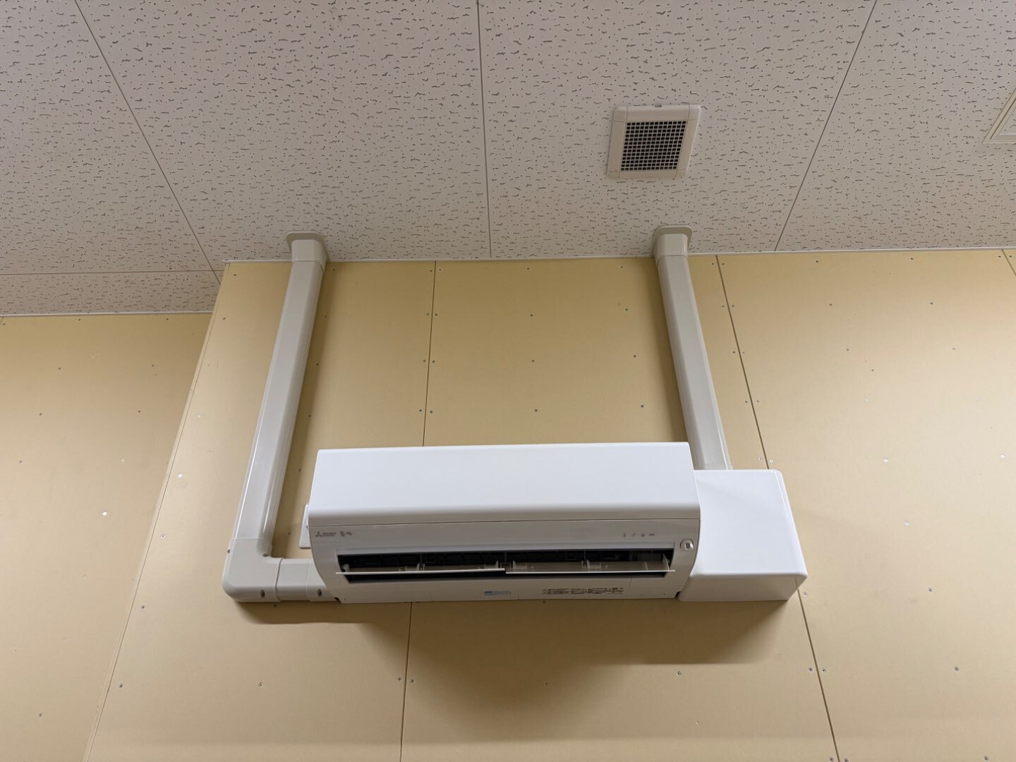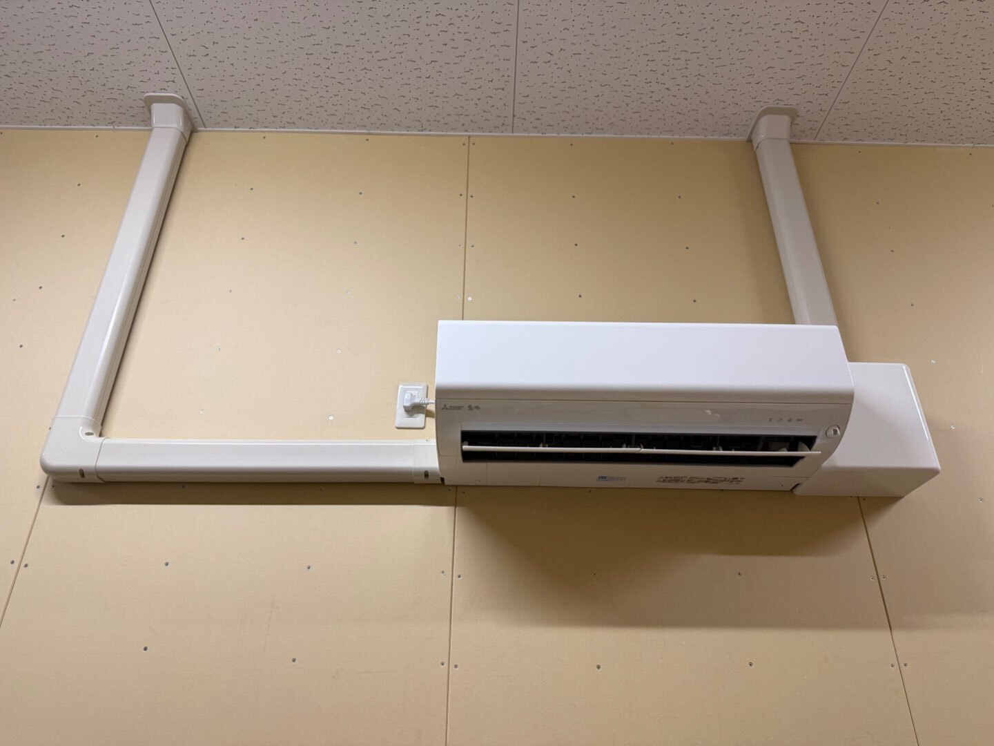 既存の壁面には配管用の開口がなく、室外機までのルート確保が必要だったため、天井付近を通すダクト配管工法を採用。室内の美観を損なわず、将来のメンテナンスも容易なレイアウトで施工を行いました。