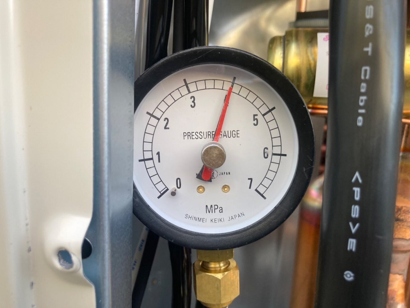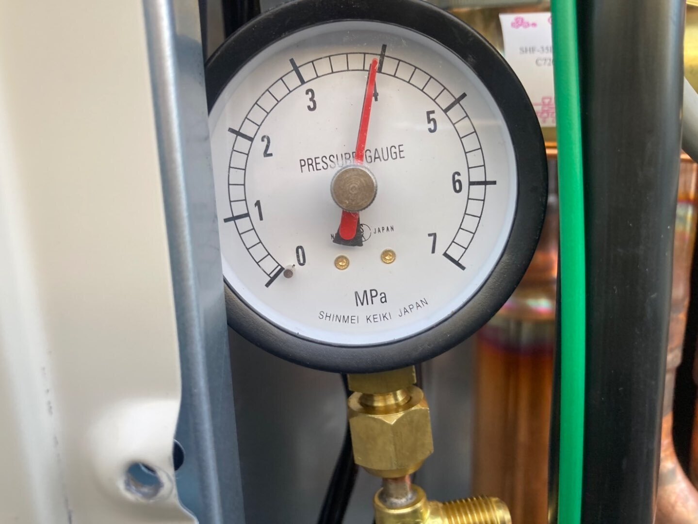 圧力計による数値確認を行い、冷媒配管内の空気や水分を完全に除去した状態で冷媒を封入しています。