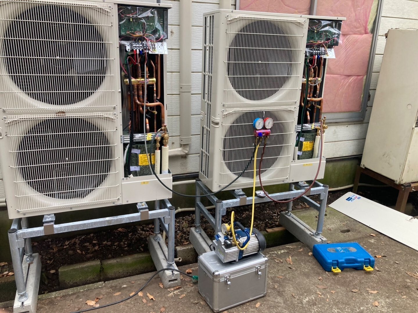 配管施工後は、真空ポンプを使用した確実な真空引き作業を実施。