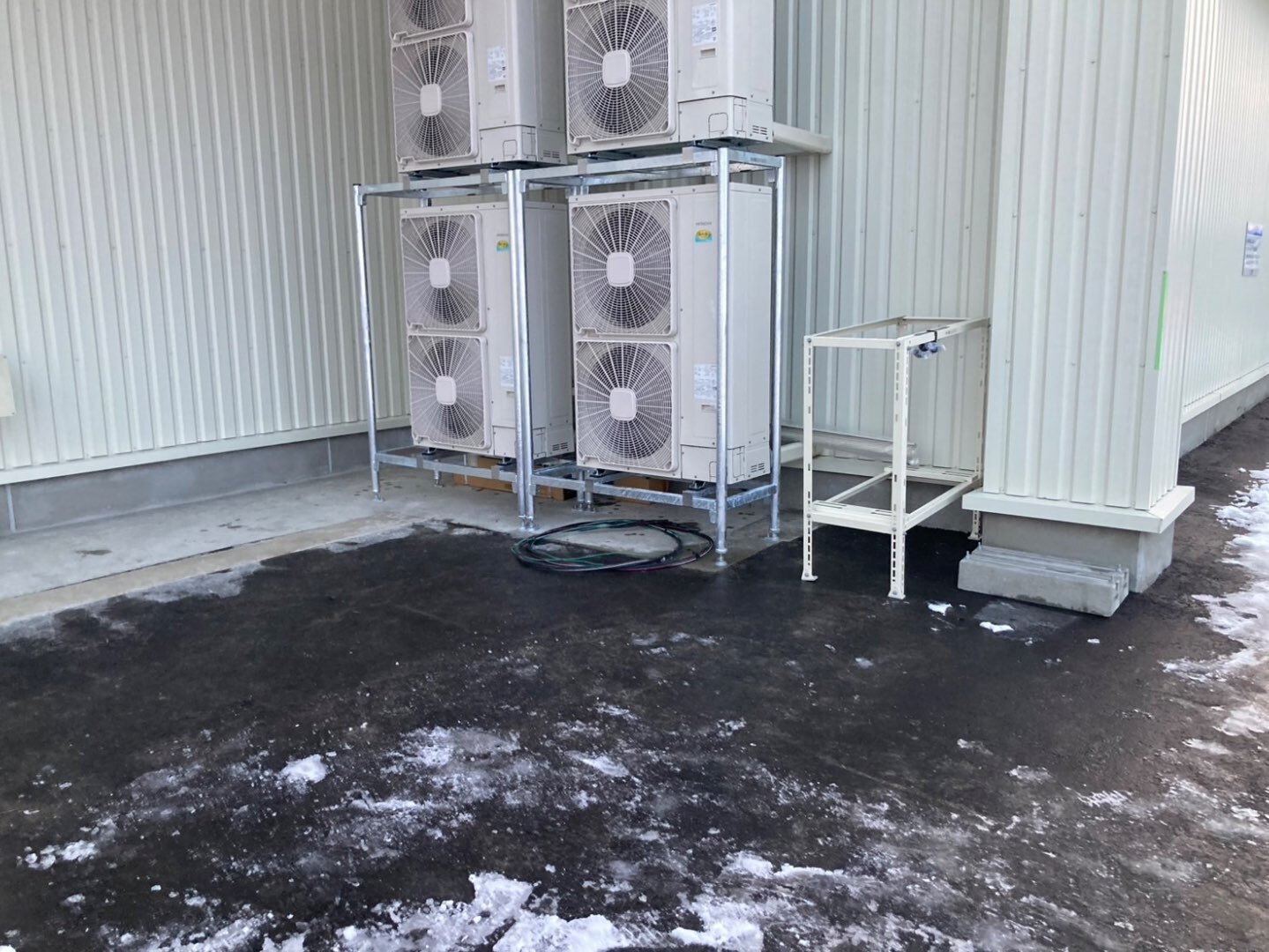 室外機は溶融亜鉛メッキ処理を施した耐候性の高い二段架台を採用し、基礎アンカー固定により強固に設置しています。